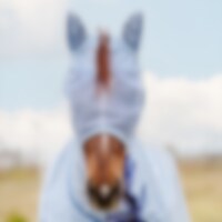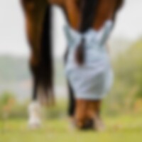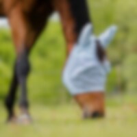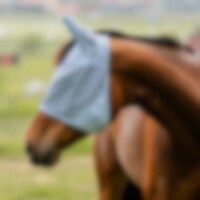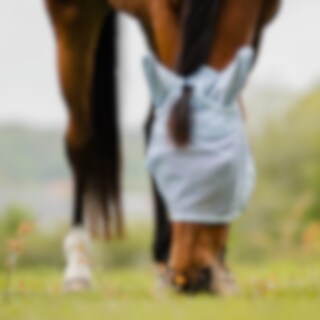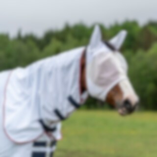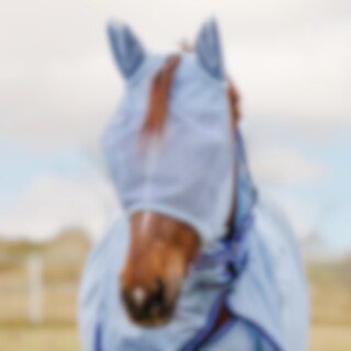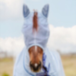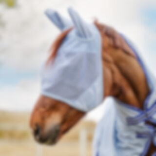 Fluemaske i blød, finmasket polyester, kantet med fleece for at minimere risikoen for slidmærker. Ører i et lidt tættere net, hul til pandelokken. Fastgøres under hagen med velcro.