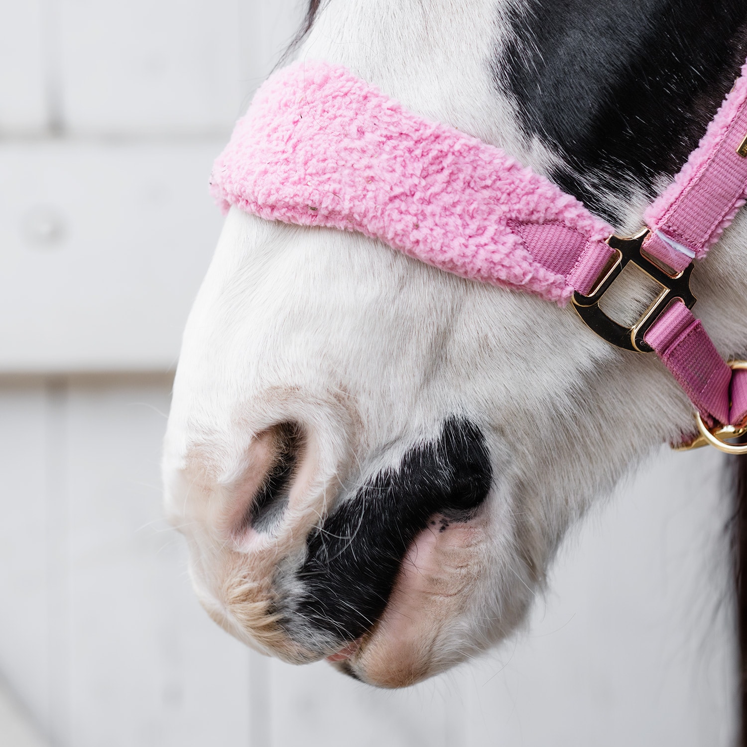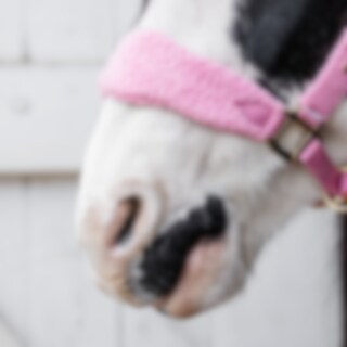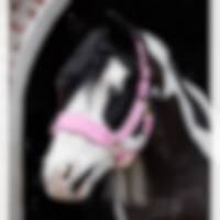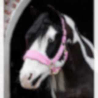 En grime med blød pilé ved næsen, halsen og de justerbare sidestykker. Guldfarvede spænder.