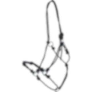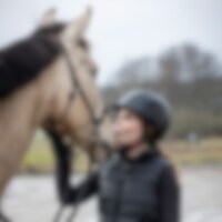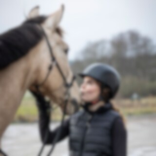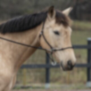 Rebgrime med sølvfarvede spænder, som gør den lettere at tage af og på. Løbende metalring under næsen. Man kan ride med den, så sættes tøjlerne i spænderne ved siden af næsen.