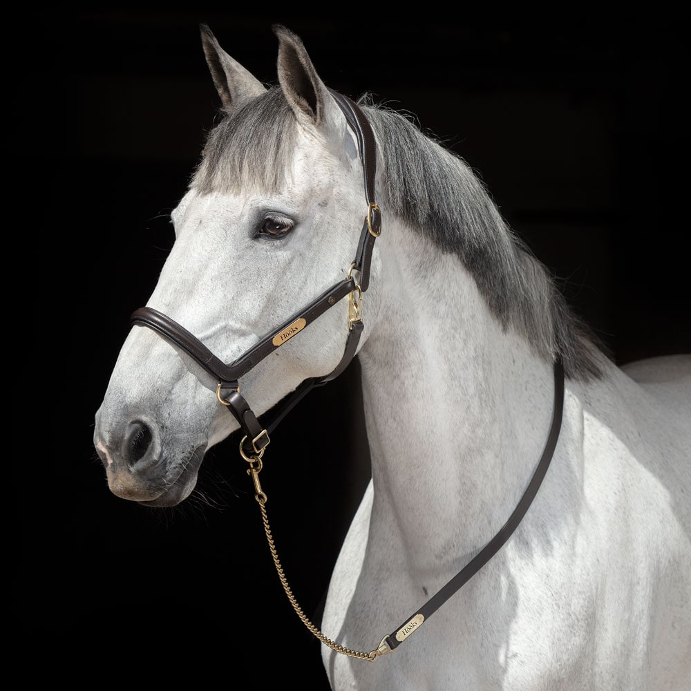 Grimeskaft 200 cm i totallængde, læderdel 150 cm og lænkedel 50 cm. Sort – sort læder med sølvfarvet lænke. Mørkebrun – mørkebrunt læder med messingfarvet lænke. Navneplade Hööks. Karabinhage.