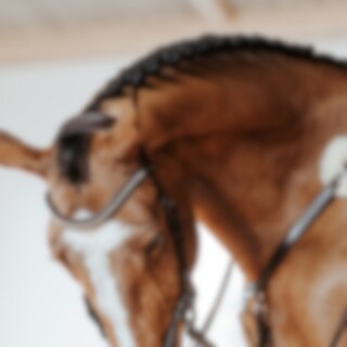 Fortøj med løs martingal. Dobbelt sadelfæste. Lammeskindsforede plader og med sølvfarvede spænder.