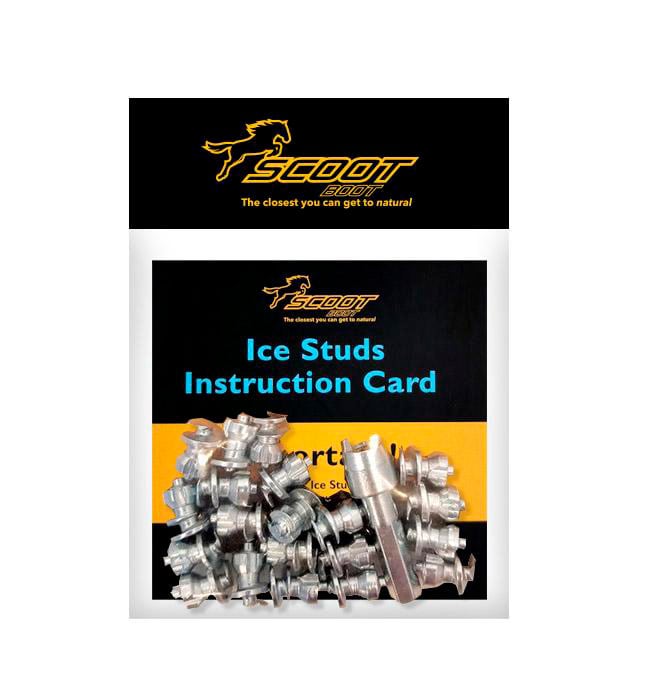 Antiskrid med knop. Du skal bruge en skruetrækker og et 4,5 mm bor til at forbore hullet med inden du sætter knoppen i. Du skal ikke forbore hullet helt igennem sålen kun et par mm ind. Indeholder 20 x Scoot Ice Studs knopper og 1 x Scoot Ice Stud dobbeltnøgle til skruetrækker.