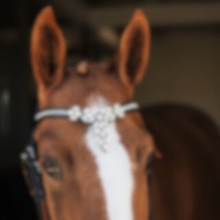 V-formet pandebånd med små hvide sten og stor dekoration i midten.