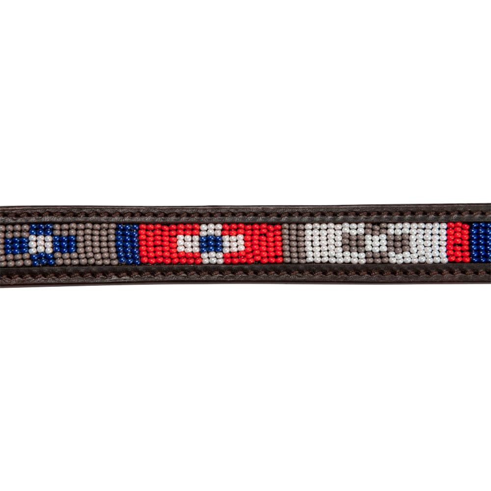 Pandebånd i blødt, behageligt læder. Dekoreret med håndsyede perler.