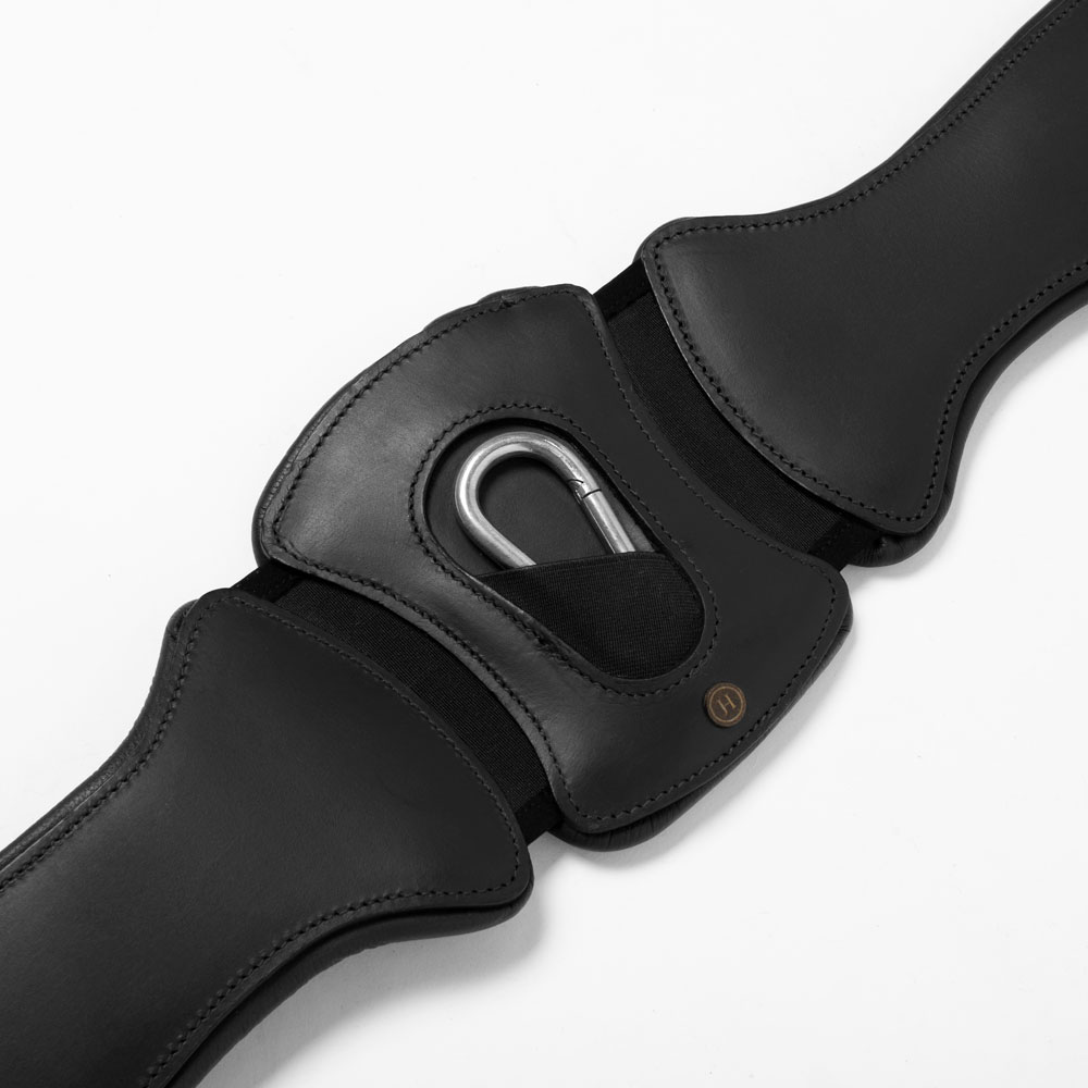 Lædergjord, som kan justeres i begge sider, så den kan justeres mellem 115-145 cm. Trykaflastende plade på midten med elastikpaneler og hurtiglukning. Blødt for.