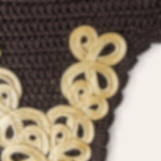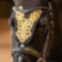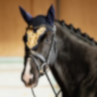 Hæklet bomuldshætte med ører i højelastisk lycra for en god pasform, fremragende til at beskytte hestens følsomme ører mod insekter under arbejdet. Dekoreret med guldpynt.