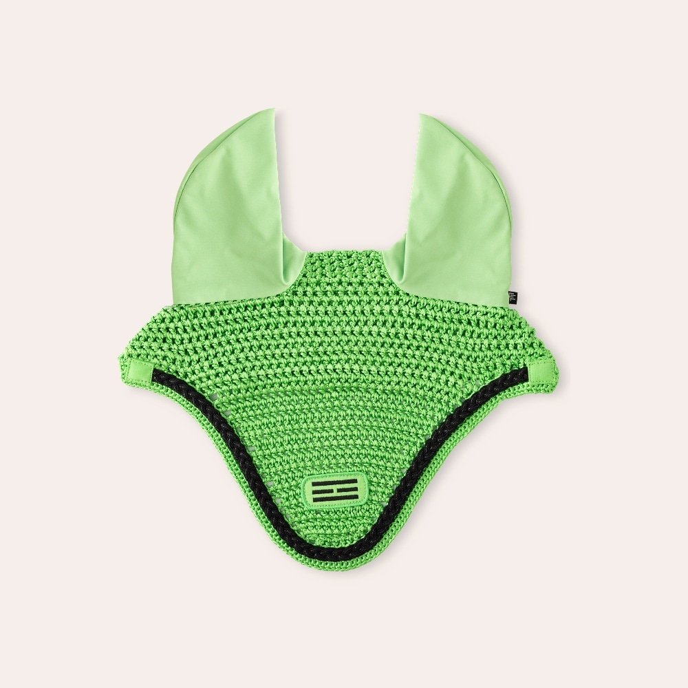 Hæklet hut i skinnende nylongarn. Elastiske ører for god pasform. Huller til hagerem holder hætten sikkert på plads. Broderet Fairfield-logo i lurex-tråd og flettet lurex-piping.