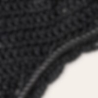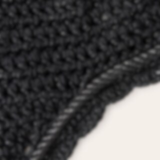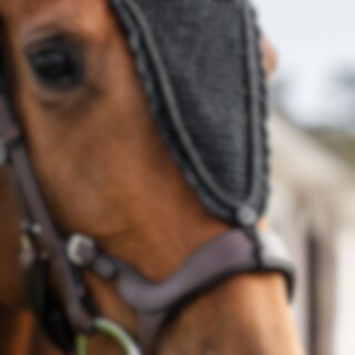 Hæklet hætte i lurex garn med ører i elastisk polyester. Lang model, der kan fastgøres til næsebåndet. Dekoreret med lurex-piping i polyestersilke. Beskytter hestens følsomme ører mod insekter og kan suppleres med lydabsorberende indlæg, hvis det er nødve