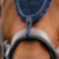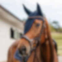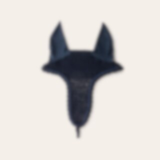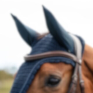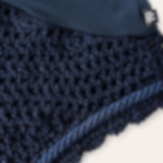 Hæklet hætte i lurex garn med ører i elastisk polyester. Lang model, der kan fastgøres til næsebåndet. Dekoreret med lurex-piping i polyestersilke. Beskytter hestens følsomme ører mod insekter og kan suppleres med lydabsorberende indlæg, hvis det er nødve