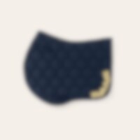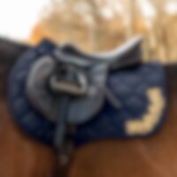 Sadelunderlag med et stærkt polyester twill ydre, en coolmax inderside og en robust polstring i 300g polyfill+0,8cm skum. Dekoreret med guldfarvet ornament i venstre side. Korte stropper foran gør det nemt at passe ind i mange sadler.