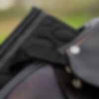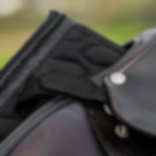 Sadelunderlag i polyester twill med et lille quiltet zigzagmønster. Robust kombiunderlag i 300g polyfill + 1,2 cm skum, der giver et robust sadelunderlag, der bliver på plads og holder formen vask efter vask. Polyester coolmax indersiden hjælper med at transportere fugt væk for at opretholde en behagelig temperatur for hesten. - Mesh-panel langs rygsøjlen for øget ventilation. Forstærket ved gjorden for ekstra holdbarhed, korte velcrostropper til fastgørelse til sadlens d-ring gør, at den passer under de fleste sadelmodeller. Dekoreret med glimmerbånd og silkepiping i lurex, Hvid sadelunderlag med hvid inderside, andre med sort indvendigt.