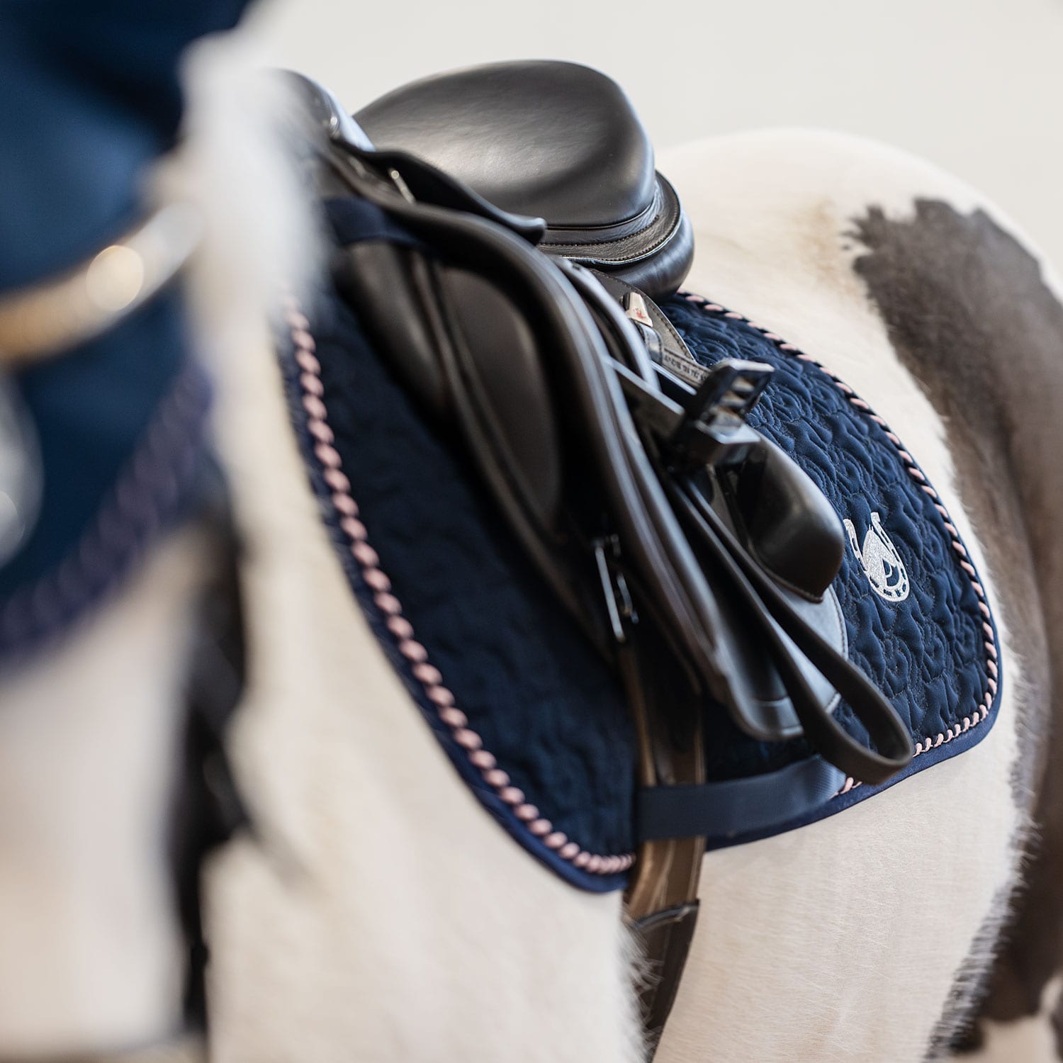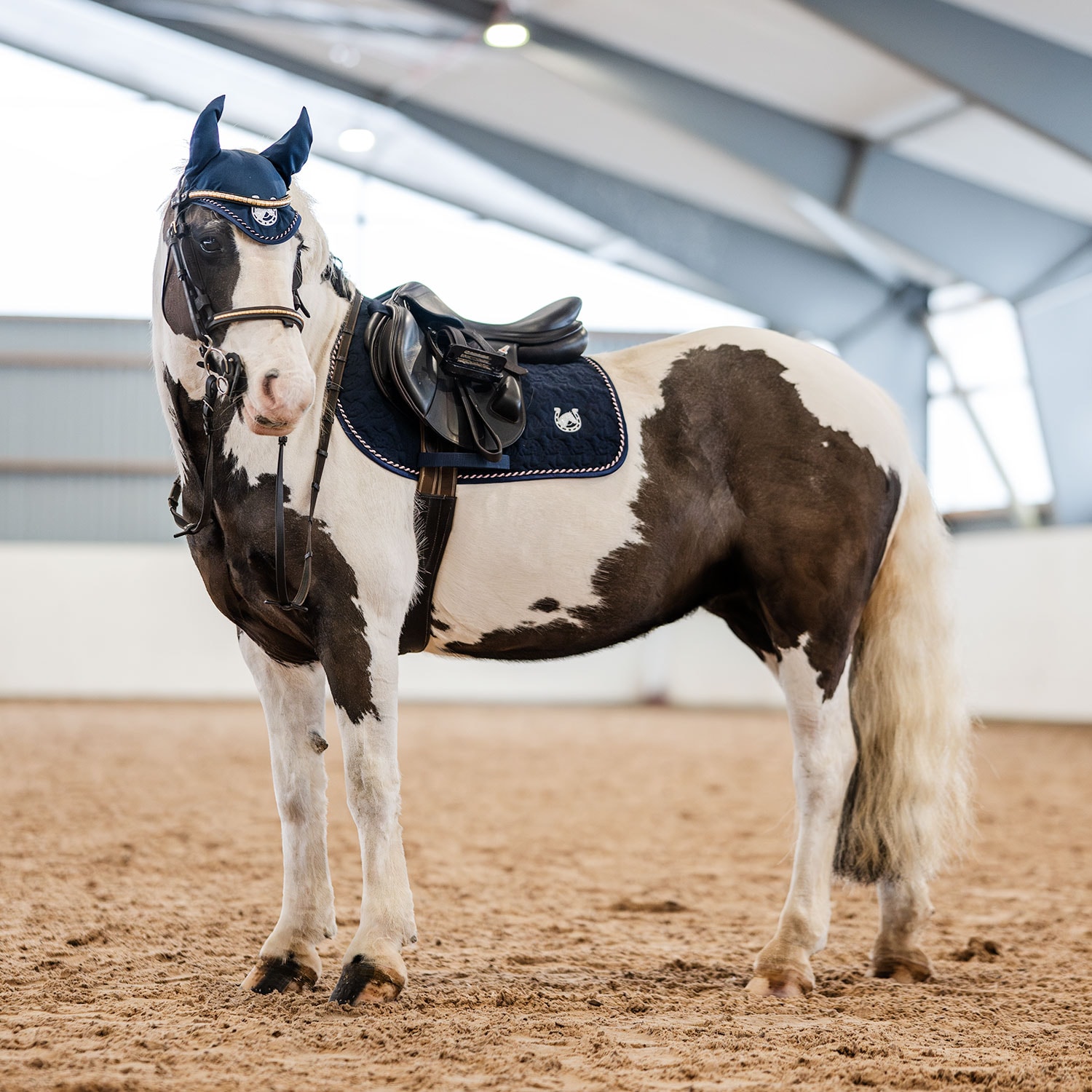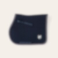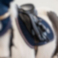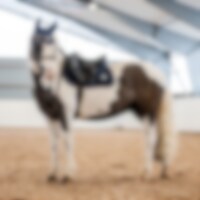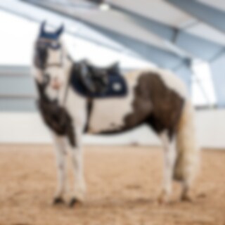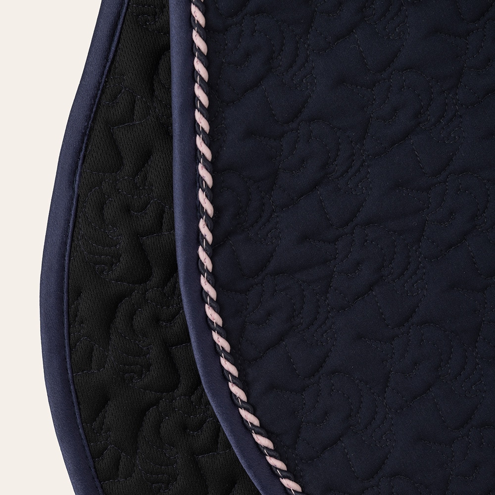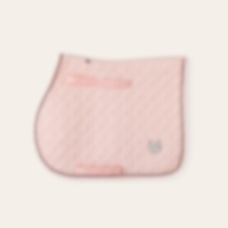 Quiltet schabrak med enhjørninger i kraftig polycotton twill, glitterkanter og tofarvet silke-piping. Glitterbroderi i hjørnet. Lange stropper med velcro til fastgørelse i gjordstropperne. Kombinationspolstring i 180 g polyfill og 1 cm skum. Coolmax funkt