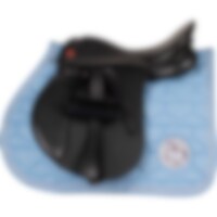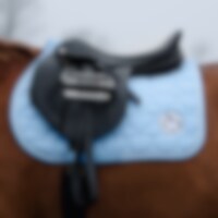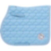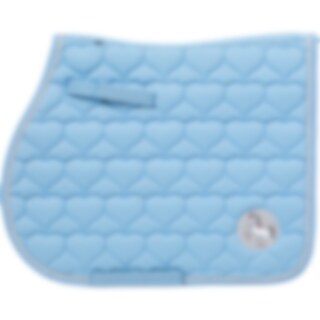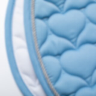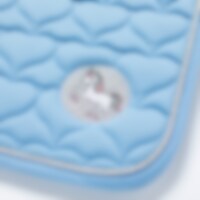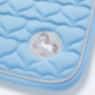 Hjertequiltet underlag i polyester/bomuldstwill. Stabil kombinationspolstring i 180 g polyester + 1 cm skumgummi sikrer, at underlaget holder sin form og ligger stabilt på sin plads. Inderside i polyester coolmax, der hjælper med at transportere fugt væk fra hesten. Dekoreret med lurexpipe og skinnende enhjørningebroderi.