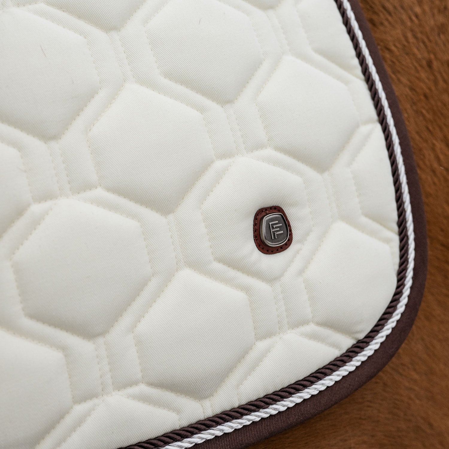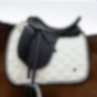 Quiltet underlag med yderside i slidstærkt polyester/bomuldstwill. Stærk kombinationspolstring i 300 g polyfill + 1 cm skum giver et robust underlag, der holder formen og bliver på plads. Underside i funktionsmateriale af 100 % polyester, som hjælper med at transportere fugt væk fra hesten. Teddyfor i nakken modvirker slidmærker, og 3D mesh-panelet langs rygsøjlen giver øget ventilation. Ekstra forstærkning ved sadelgjorden giver øget slidstyrke, og korte stropper til fastgørelse til sadlens D-ring gør, at underlaget passer til de fleste sadler. Dekoreret med to silkepipes og et metallogo.