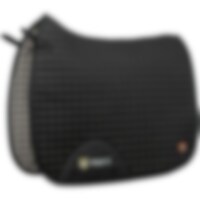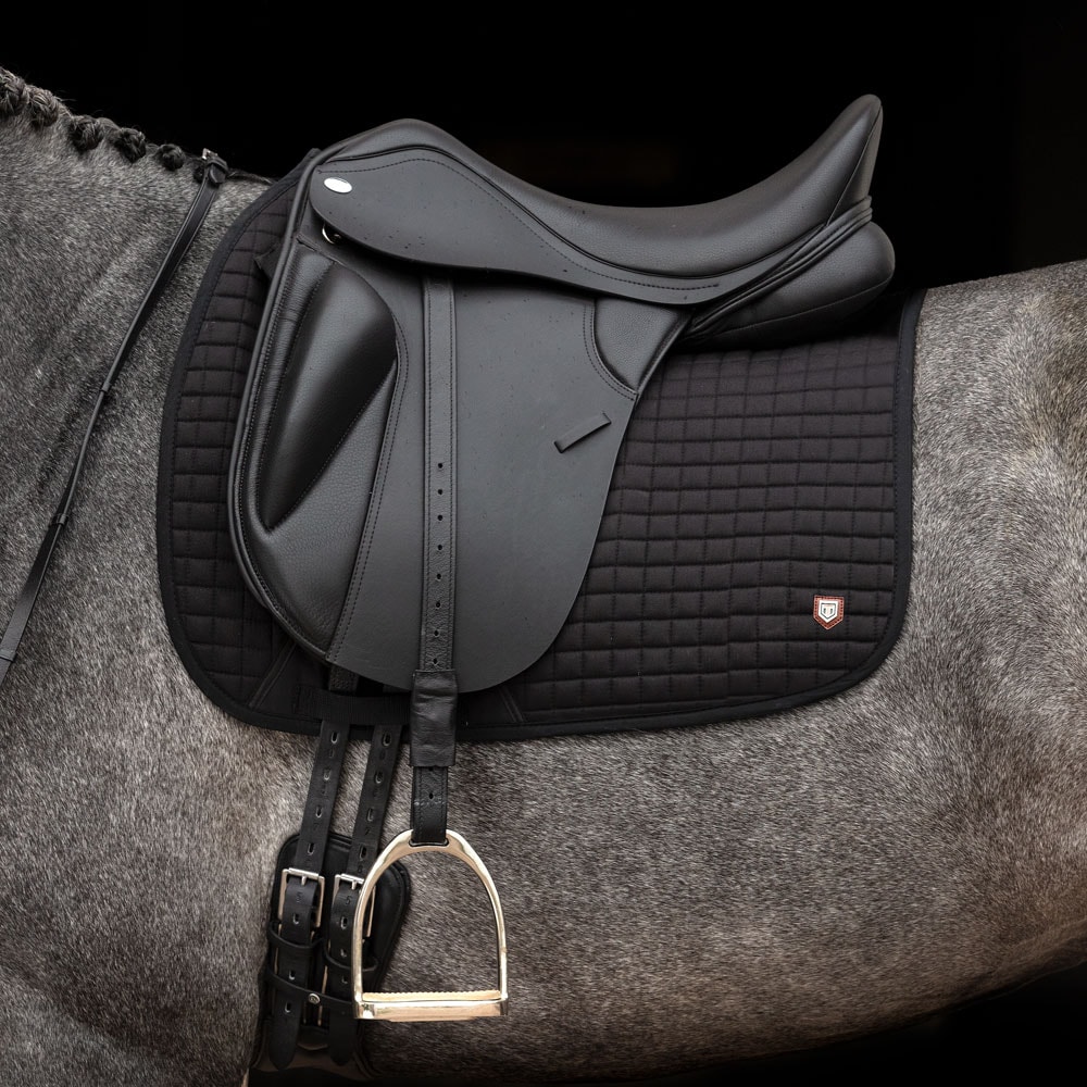 Quiltet bomuldsunderlag med inderside i kølende Coolmax funktionsmateriale, som leder fugt væk. Panel i 3D mesh langs med rygraden for at give yderligere ventilation. Kort strop med elastik til at sætte fast i sadlens D-ring, så den passer til de fleste modeller. Ekstra forstærkning ved sadelgjorden for at reducere risikoen for slitage. Trinity-broderi på gjordforstærkningen samt Trinity metallogo på venstre side.