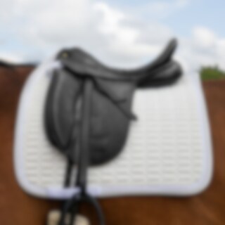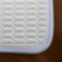 Sadelunderlag i polyester twill med et lille quiltet zigzagmønster. Robust kombiunderlag i 300g polyfill + 1,2 cm skum, der giver et robust sadelunderlag, der bliver på plads og holder formen vask efter vask. Polyester coolmax indersiden hjælper med at transportere fugt væk for at opretholde en behagelig temperatur for hesten. - Mesh-panel langs rygsøjlen for øget ventilation. Forstærket ved gjorden for ekstra holdbarhed, korte velcrostropper til fastgørelse til sadlens d-ring gør, at den passer under de fleste sadelmodeller. Dekoreret med glimmerbånd og silkepiping i lurex. Hvid sadelunderlag med hvid inderside, andre med sort indvendigt.