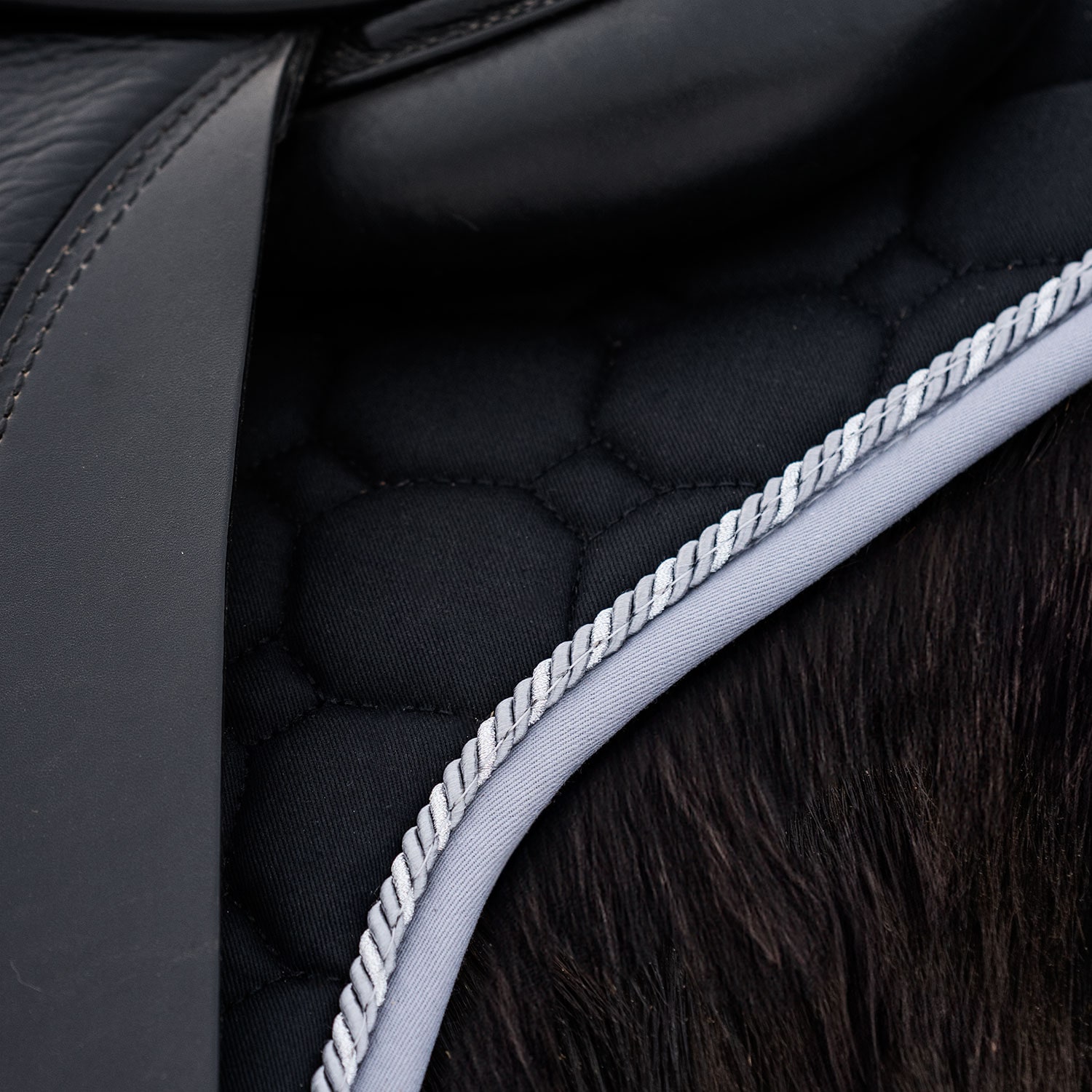 Quiltet bomuldsunderlag med fast kombinationspolstring i 300 g polyfilt + 0,8 cm skum. Inderside i funktionsmateriale af 100 % polyester, som hjælper med at transportere fugt væk fra hesten. Korte stropper til fastgørelse i sadlens d-ring gør dækkenet vel