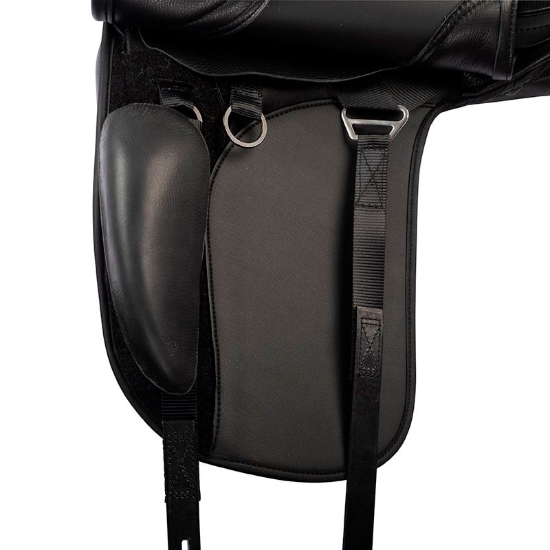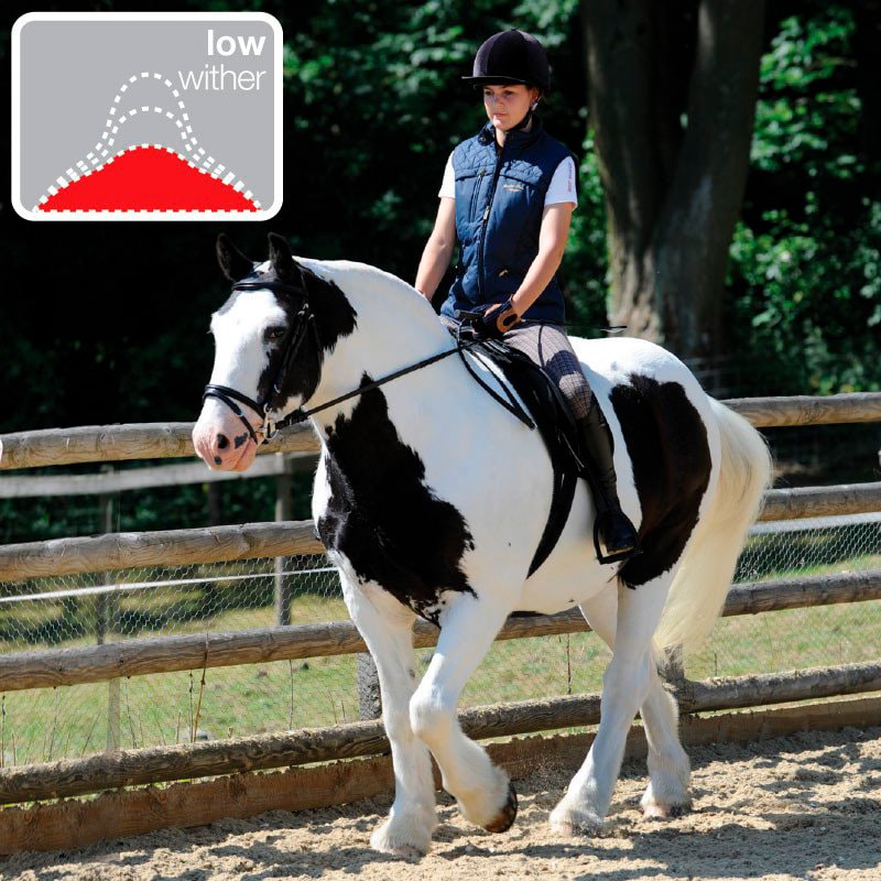 Dressursadel udviklet til at passe til mere brede heste. Panelerne er designet, så rytteren får en tættere kontakt med hesten. Thorowgoods specialudviklede dressurbom og flytbare klodser gør det lettere for rytteren at sidde i en god position. Kvalitetslæder i sæde og ved knæstøtten giver fornemmelsen af en lædersadel. Stoppet med 100 % britisk uld.