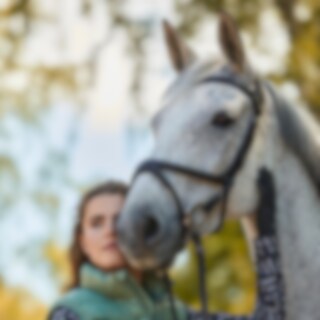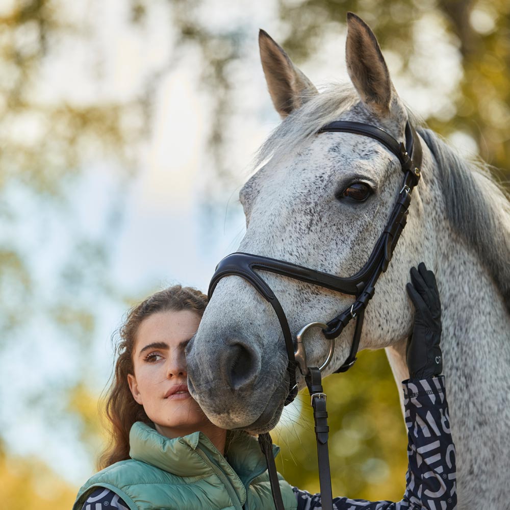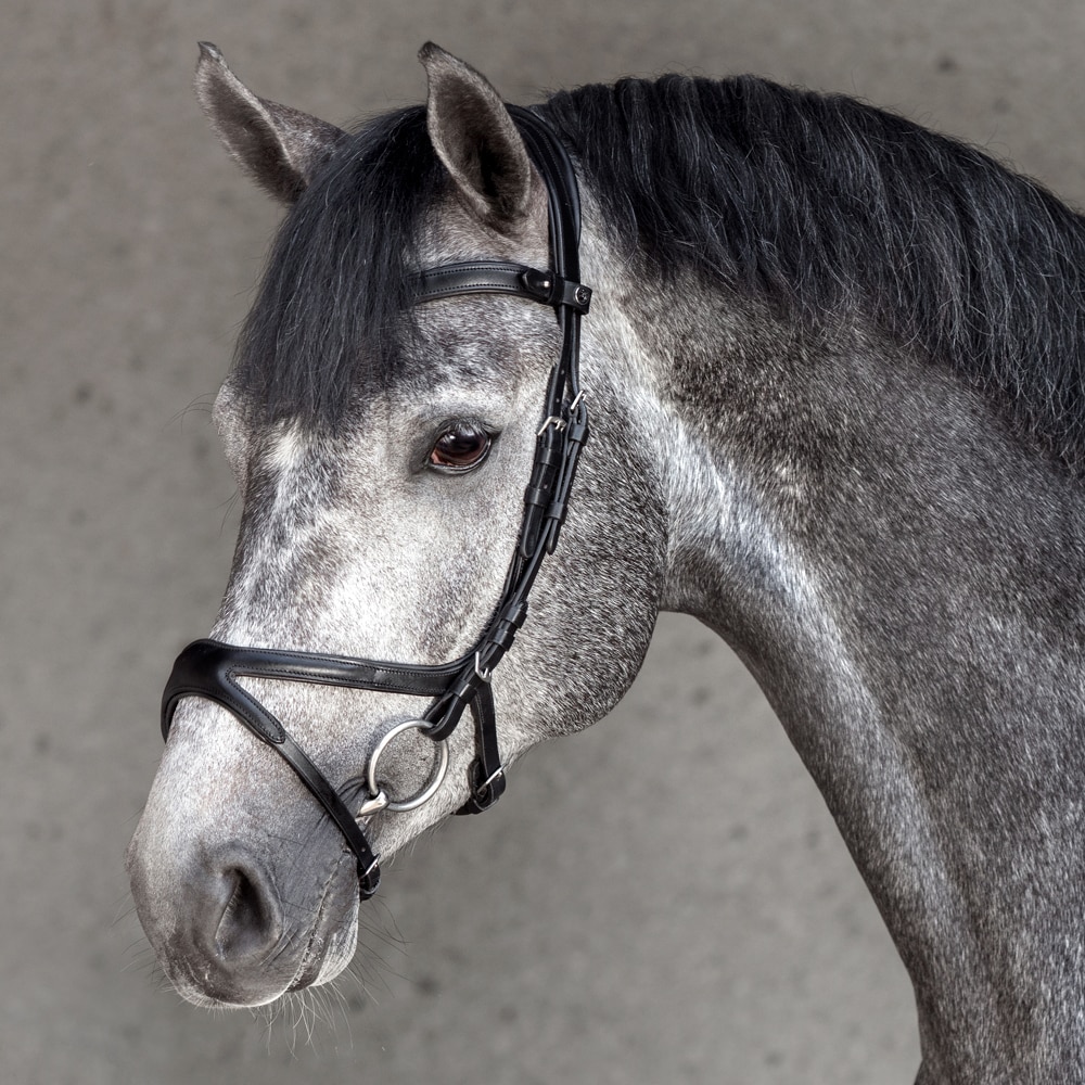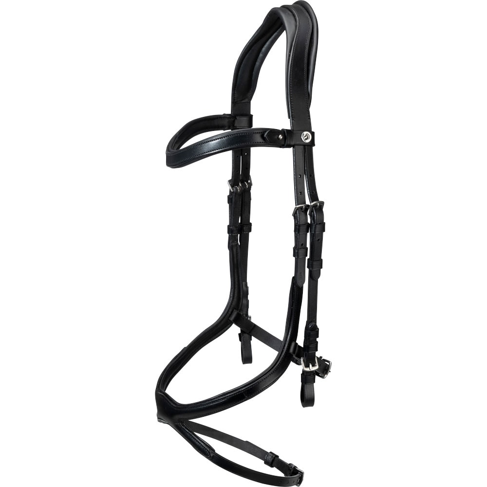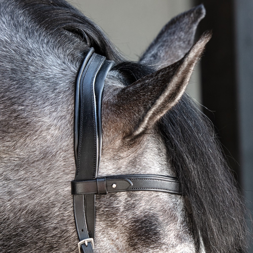 Krydstrense med blød lidt bred næseplade, drejet nakkestykke med blød, forhøjet polstring og drejet pandebånd. Nakken kan vendes, og pandebåndet har hurtiglukning.
