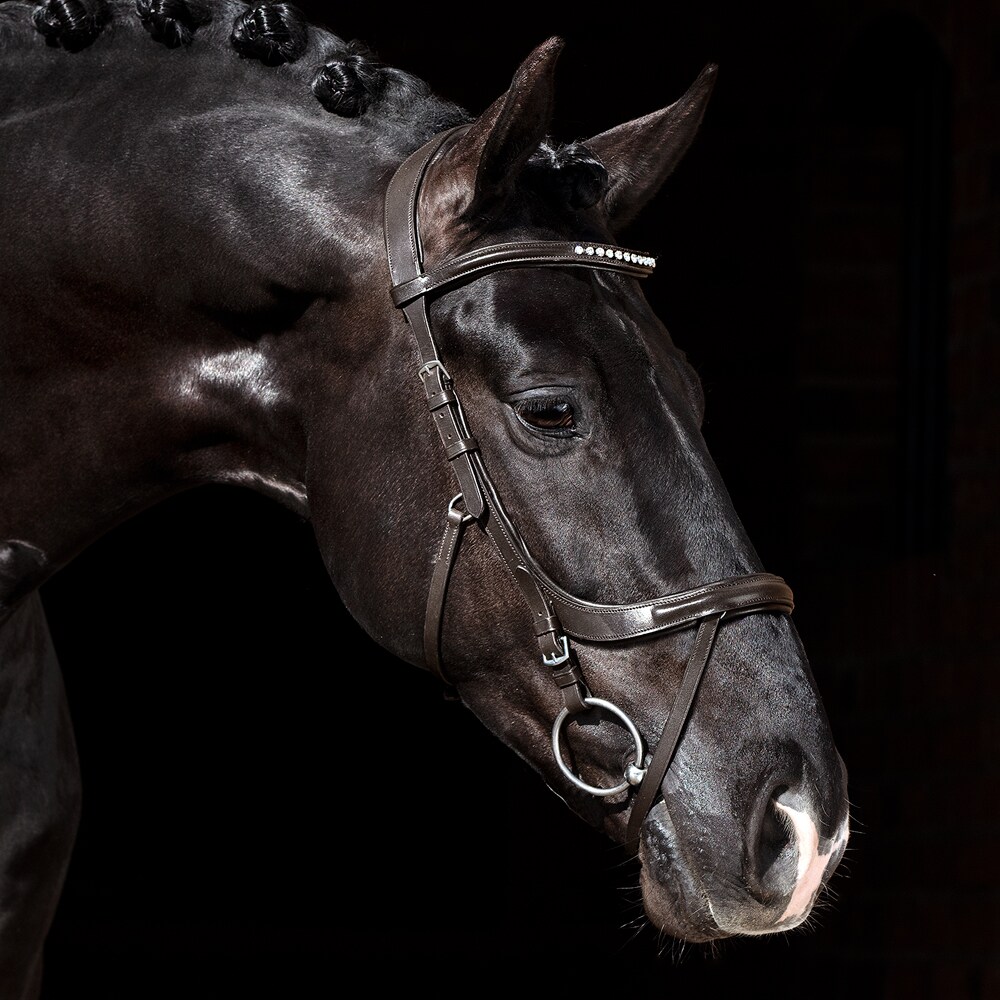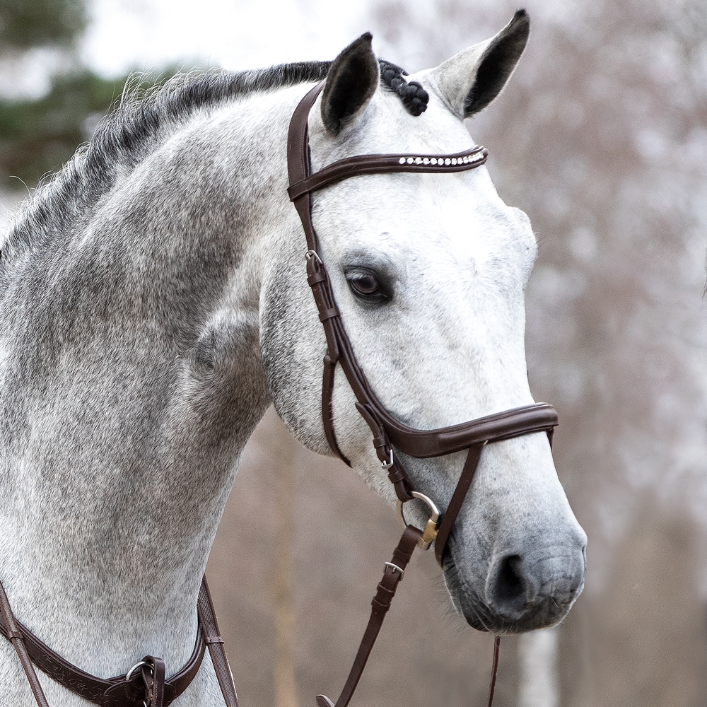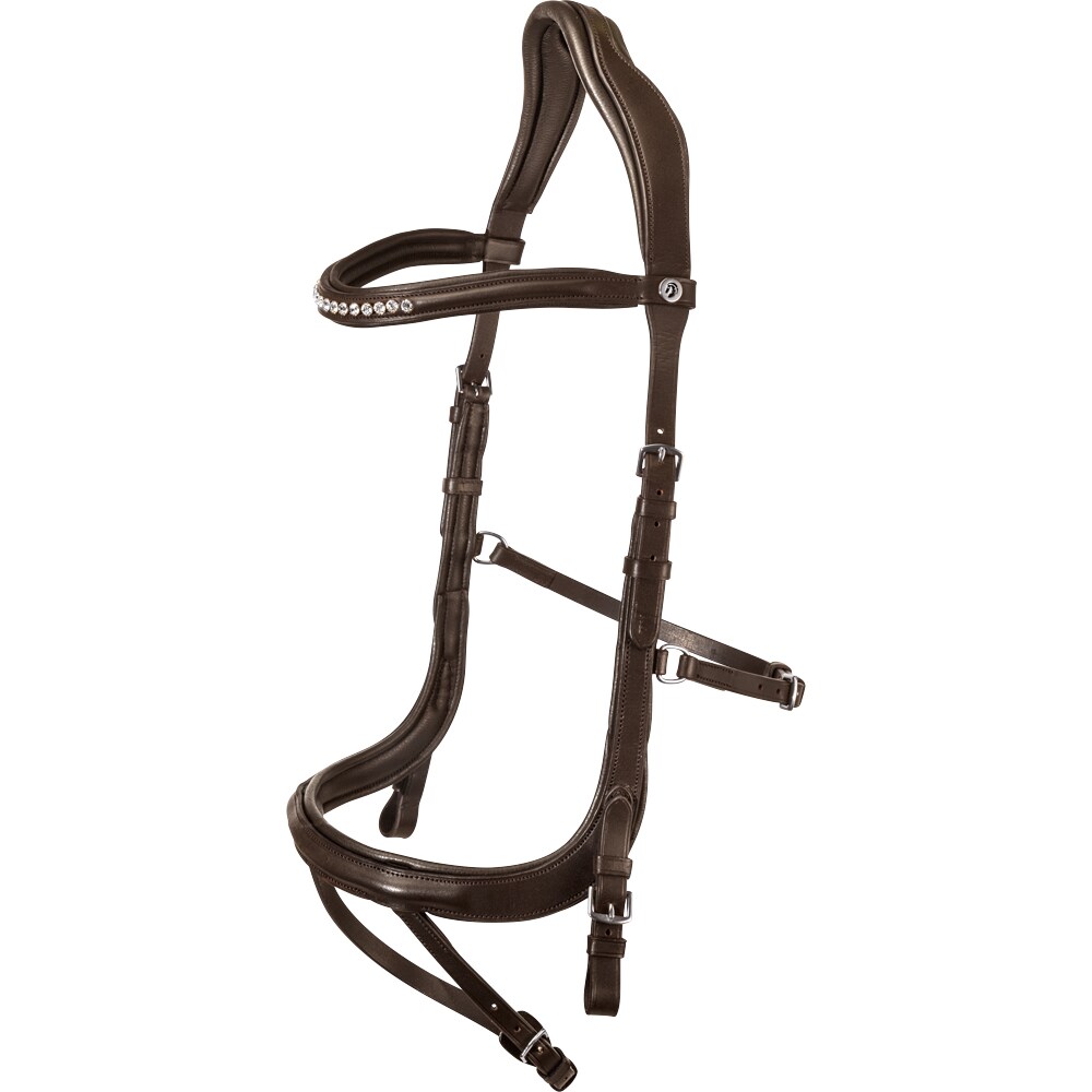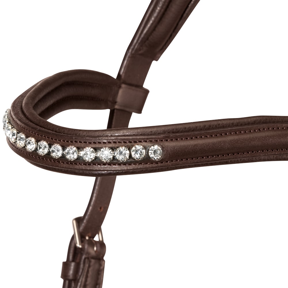 Trense med næsebånd formet så der ikke kommer noget tryk på tænder og følsomme nervebaner, kombineret næserem med skjulte D-ringe. Anatomisk formet nakkestykke med blød polstring. Buet pandebånd med hvide sten.