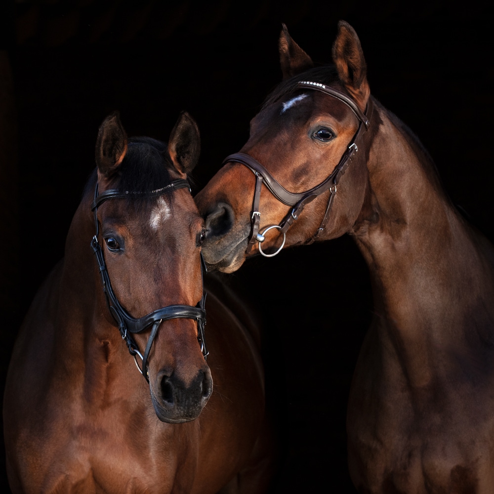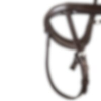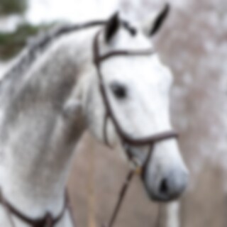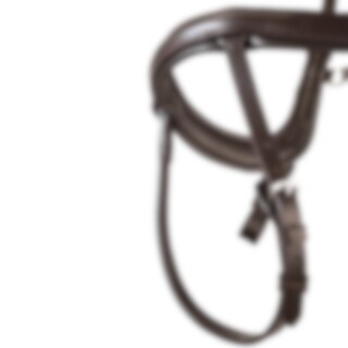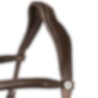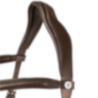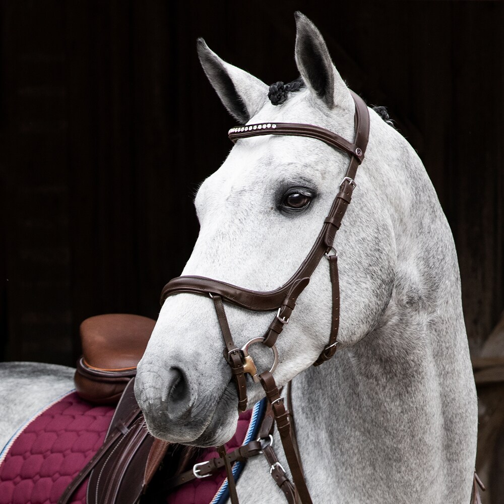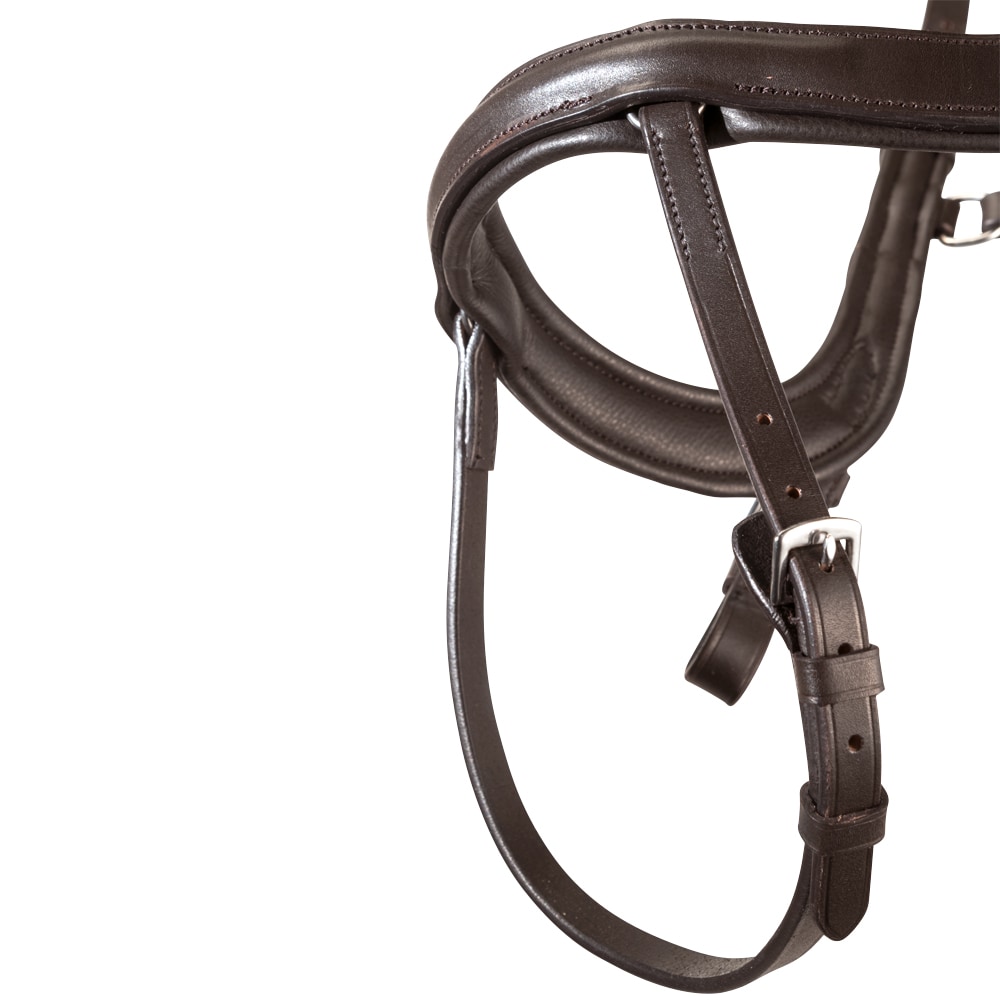 Trense med næsebånd formet så der ikke kommer noget tryk på tænder og følsomme nervebaner, kombineret næserem med skjulte D-ringe. Anatomisk formet nakkestykke med blød polstring. Buet pandebånd med hvide sten.