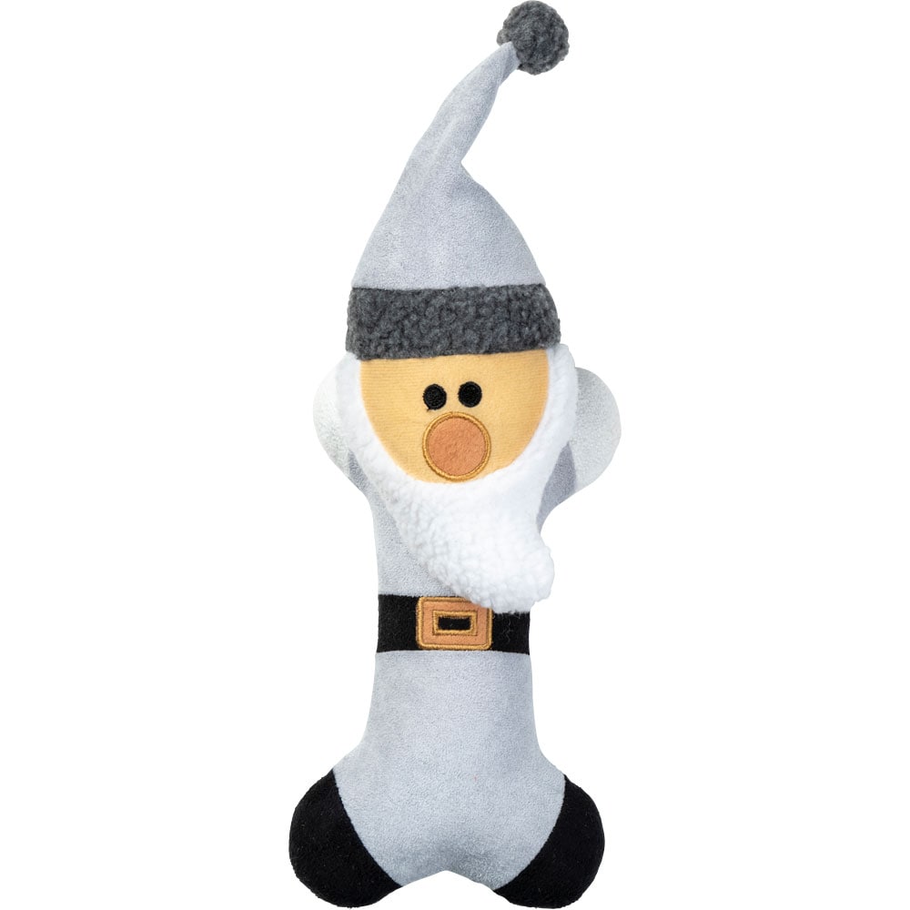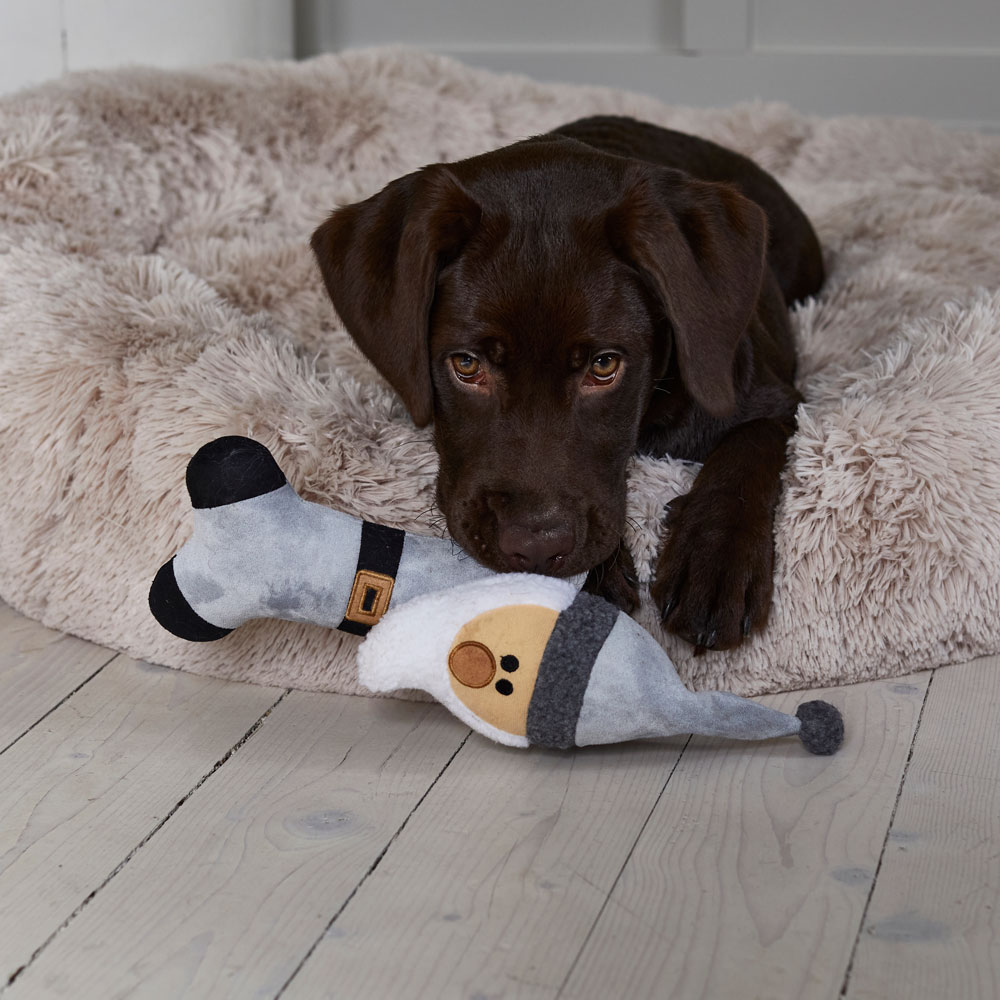 Blødt stoppet hundelegetøj i imiteret ruskind. Inspireret af gårdens nisser. Med pivelyd. Længde cirka 25 cm fra toppen af huen til bunden af kroppen.