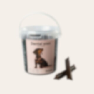Dental Snax med kyllingesmag er udviklet til at pleje din hunds tænder og tandkød. Pindens specielle konsistens gør det muligt at forme sig rundt om tænderne og rense tandkødslinjerne. Derudover produceres spyt, når hunden tygger, hvilket er med til at skylle både plak og madrester væk fra hundens tænder. Indholdet er i en spand, der er godt forseglet, så Dental snax holder sig frisk i lang tid. Det bør kun gives til din hund som en belønning mellem måltiderne, 1 pr. dag. Analytiske bestanddele: råprotein 14 %, råfedt 2 %, vand 17 %, råaske 4 %, råfibre 1 %.