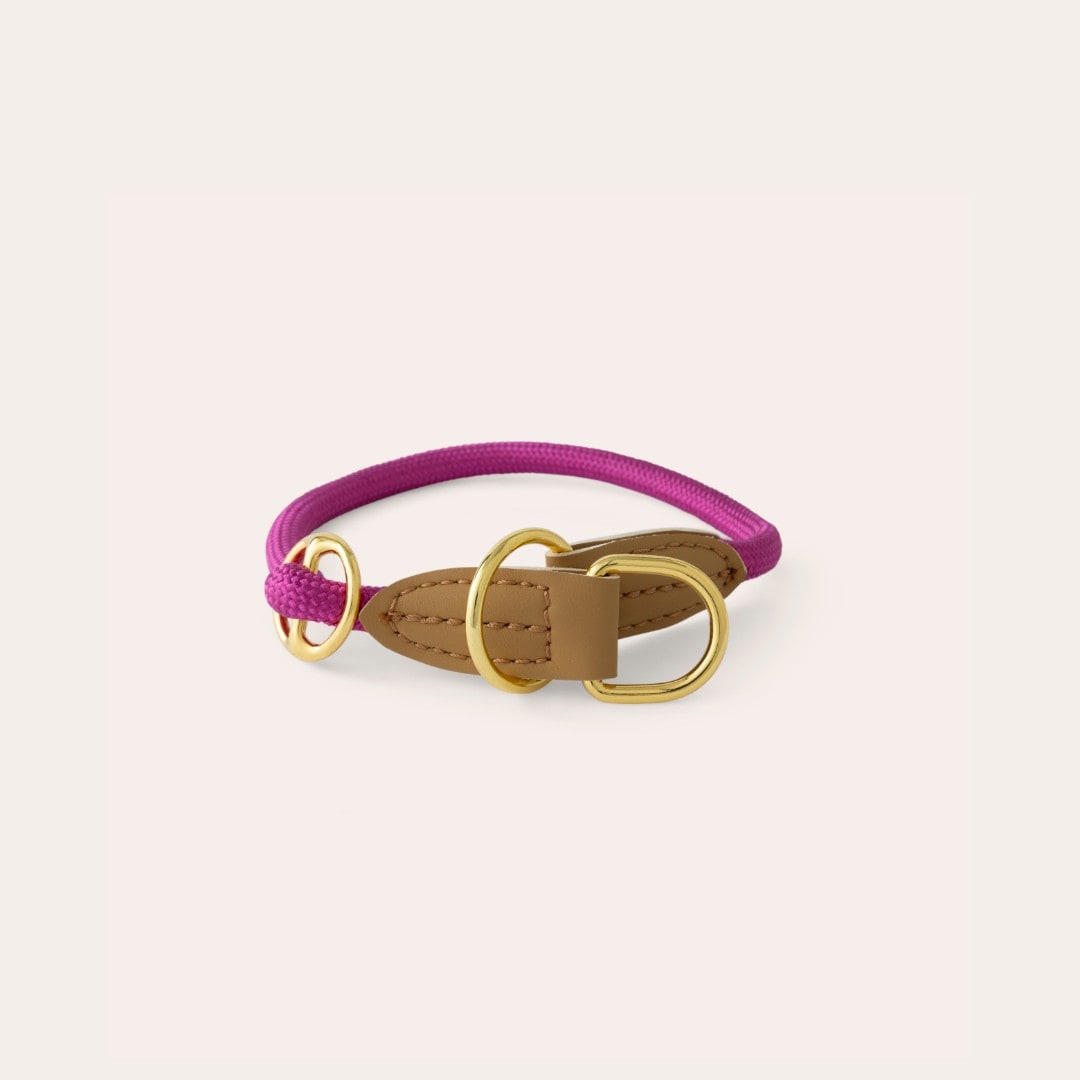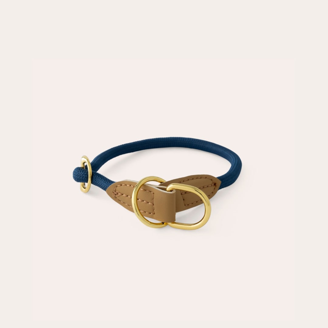 Halsbånd med helkvæl i blød polyester. Fine detaljer i guld og kunstlæder. Halsbåndet er med spænde til indstilling i ønskede størrelse. 1,2 cm i diameter. Passer sammen med artikel 052113.