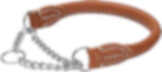 Rundsyet kvælerhalsbånd i blødt kalveskind. Sølvfarvet kæde. 30-40: Ø: 6 mm. 45-50: Ø: 8 mm. 55-65: Ø:12 mm.