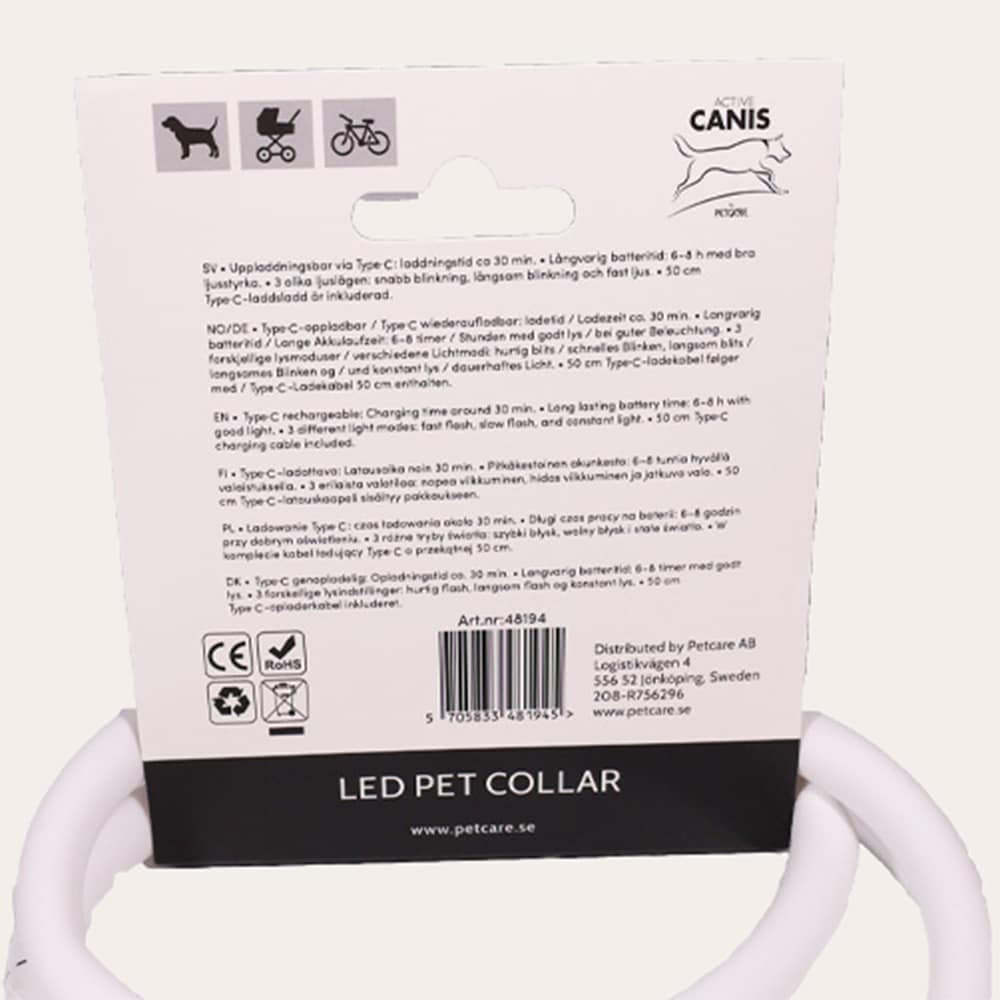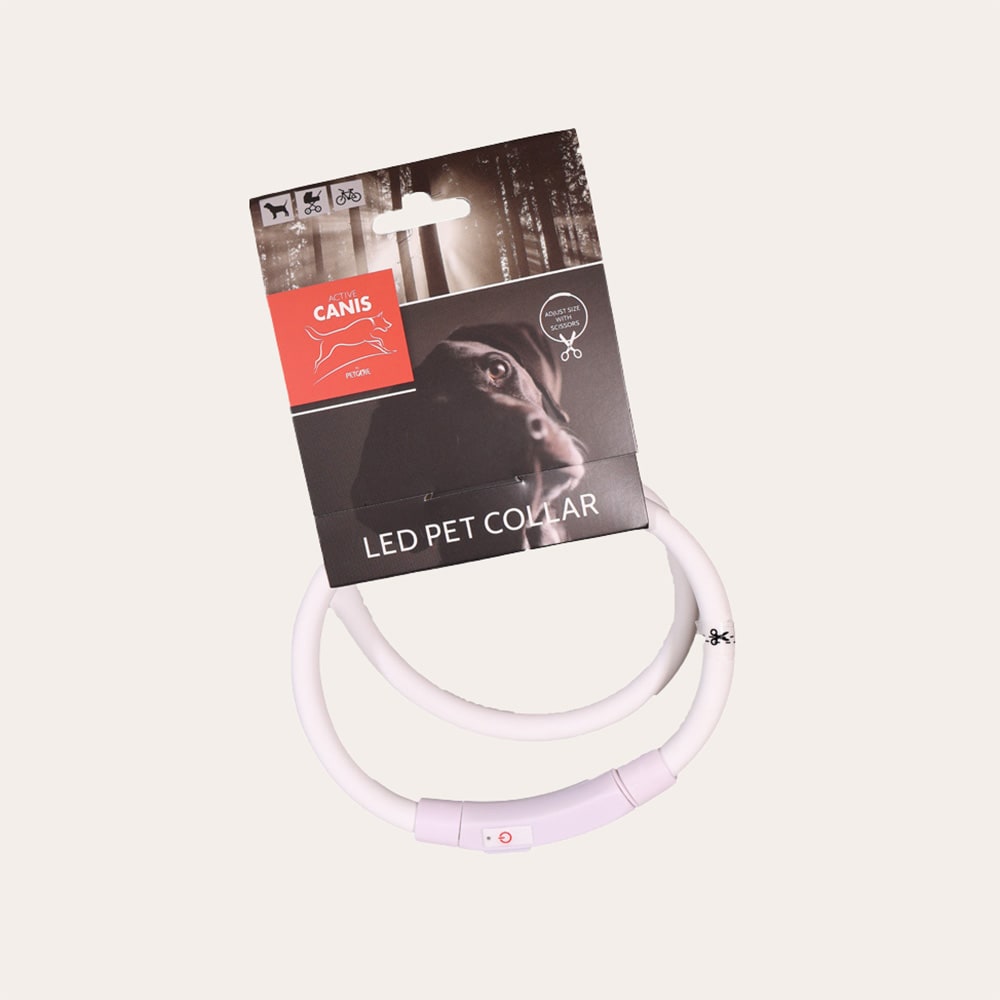 LED-halsbånd som lyser med tre, forskellige lysmåder: hurtigt blinkende, langsom blink og konstant lys. Halsbåndet oplades ved hjælp af USB-ledning. Halsbåndet er 80 cm langt, men størrelsen kan let justeres ved at det klippes af i passende længde. Det tager cirka 30 minutter at oplade batteriet, som efterfølgende holder 6-8 timer med god styrke. USB-opladningsledning medfølger i emballagen.