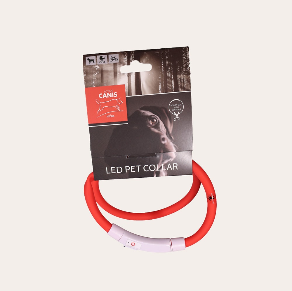 LED-halsbånd som lyser med tre, forskellige lysmåder: hurtigt blinkende, langsom blink og konstant lys. Halsbåndet oplades ved hjælp af USB-ledning. Halsbåndet er 80 cm langt, men størrelsen kan let justeres ved at det klippes af i passende længde. Det tager cirka 30 minutter at oplade batteriet, som efterfølgende holder 6-8 timer med god styrke. USB-opladningsledning medfølger i emballagen.