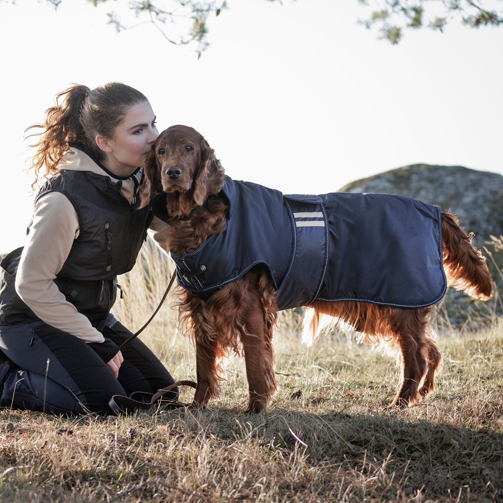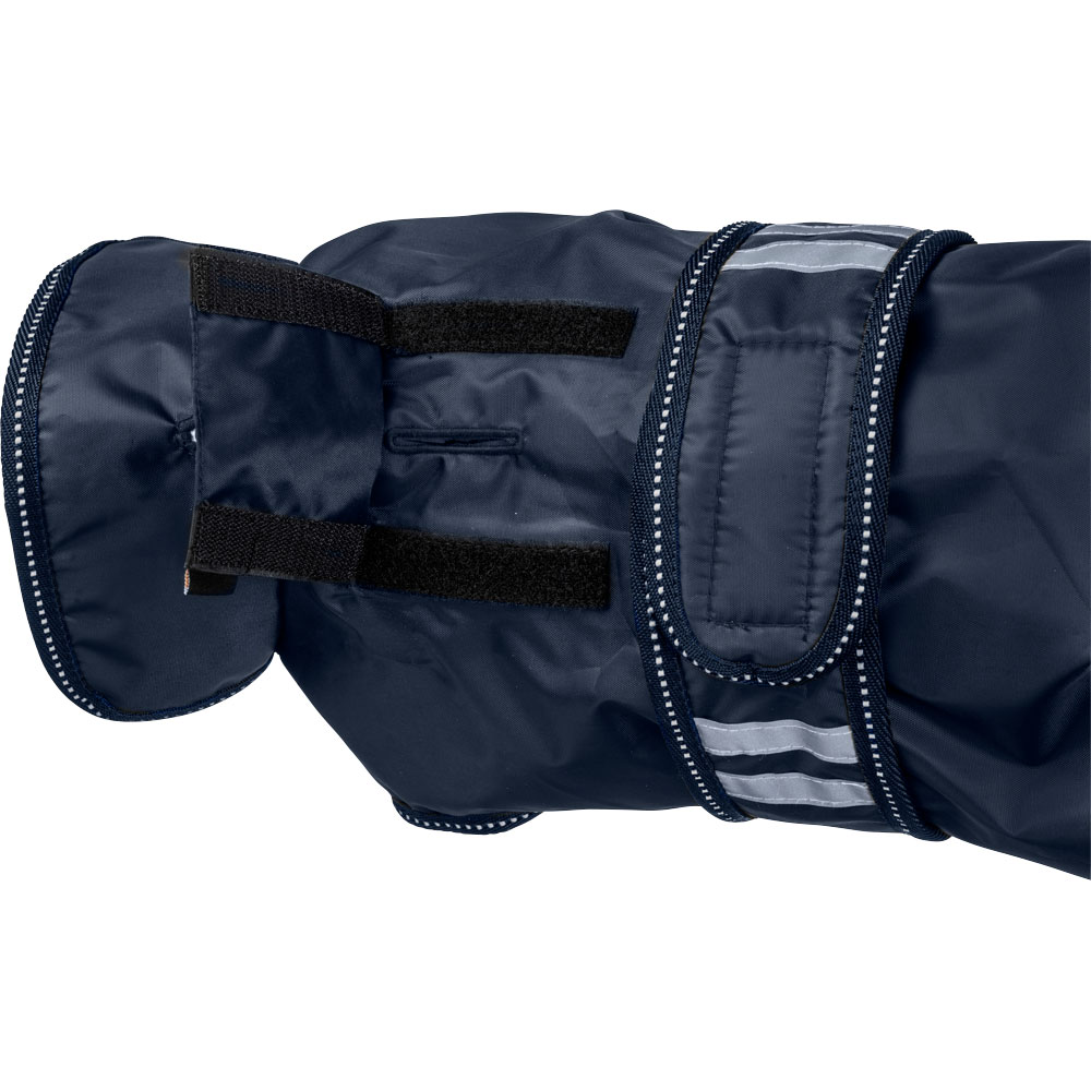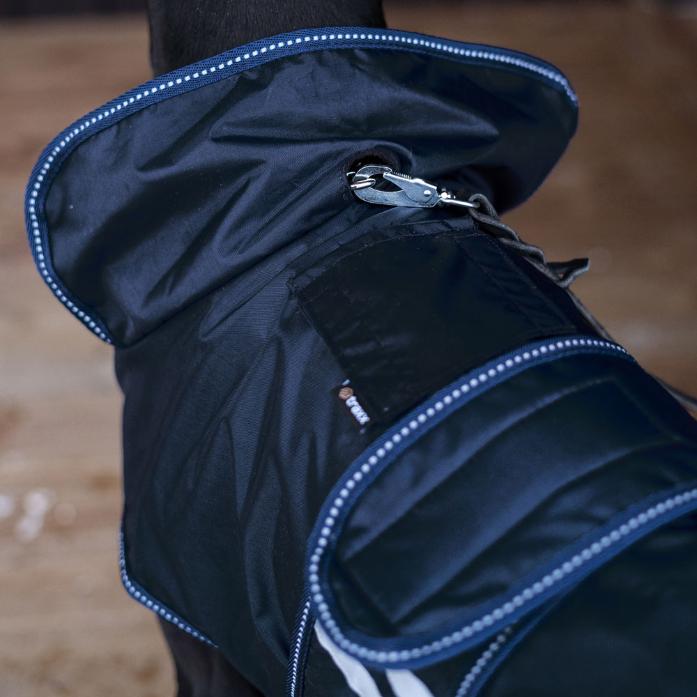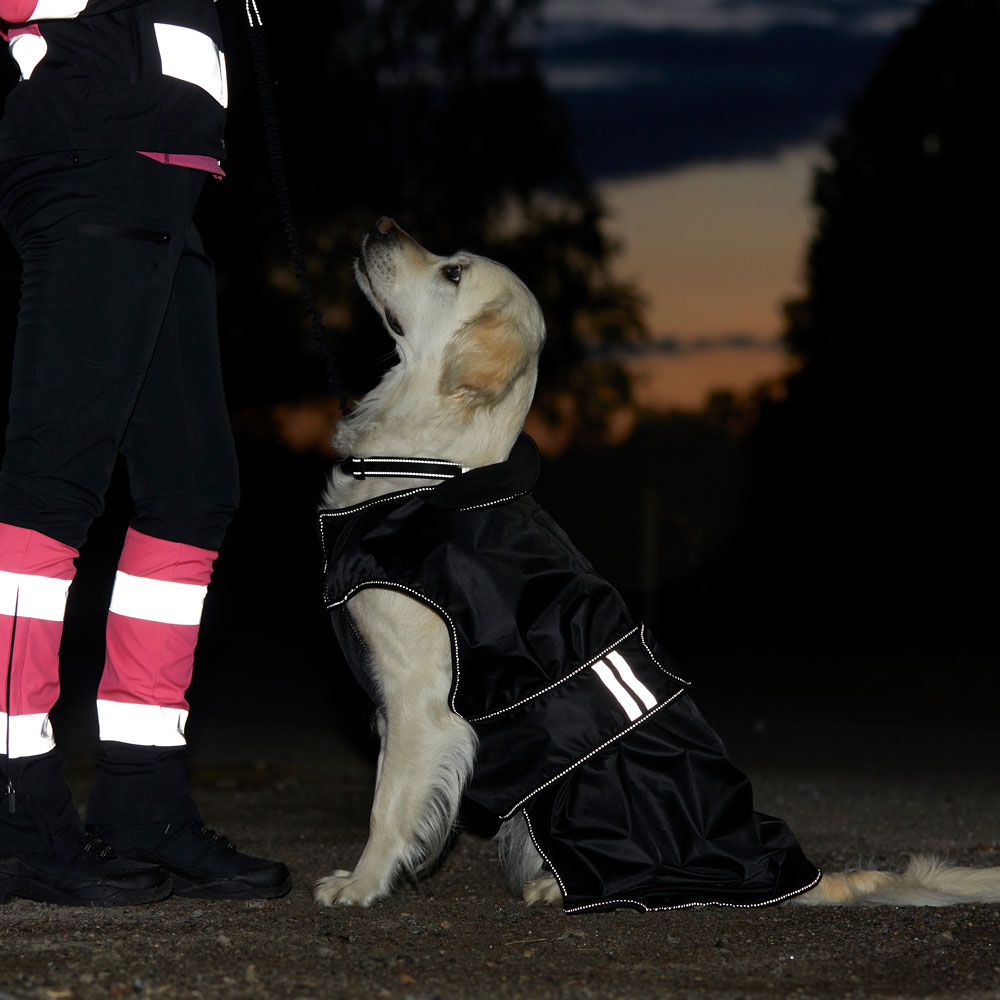 Behageligt regndækken med let for i varm fleece. Vandtæt yderstof i 210D polyester med 3000 mm vandsøjleværdi, som hjælper din hund med at holde sig tør under hele turen og med 3000 MVT åndbarhed til at undgå, kondens under dækkenet. Refleksdetaljer sikre