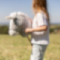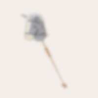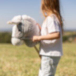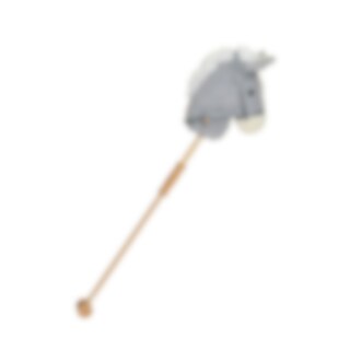 Grå/hvid kæphest med træhåndtag på siderne og træhjul i bunden af stokken, der giver børnene nem kontrol og stabilitet under leg. Børn kan nemt styre kæphesten og lade fantasien tage dem med på legende eventyr. Denne kæphest er delbar, hvilket er praktisk