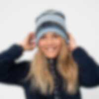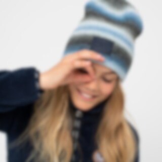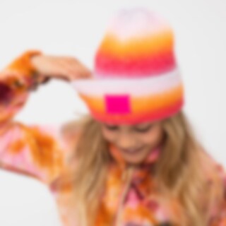 Ribbet hue i blødt, melangefarvet garn, der giver flotte farveskift. Bred opfoldet kant med vævet logoetiket.