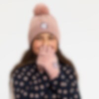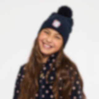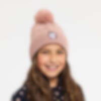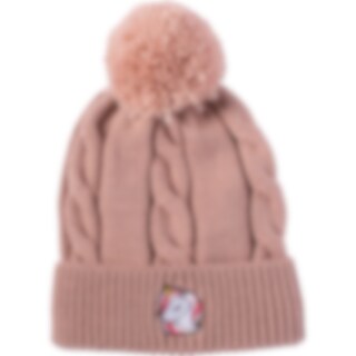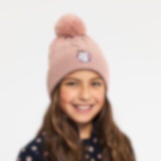Kabelstrik hue med pompon. Fold op med dekorativt broderi midt foran.
