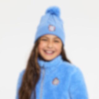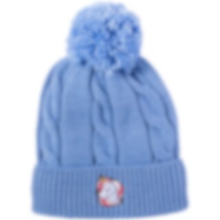 Kabelstrik hue med pompon. Fold op med dekorativt broderi midt foran.