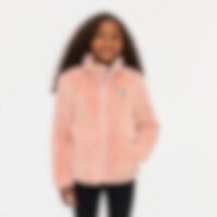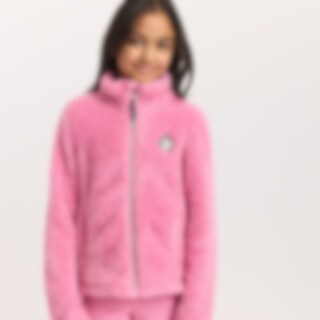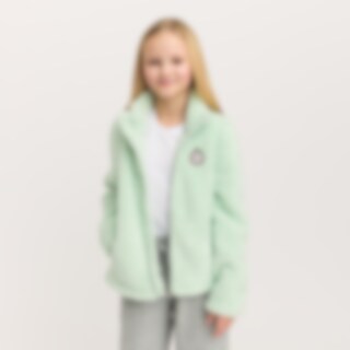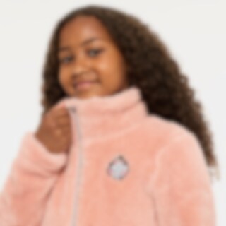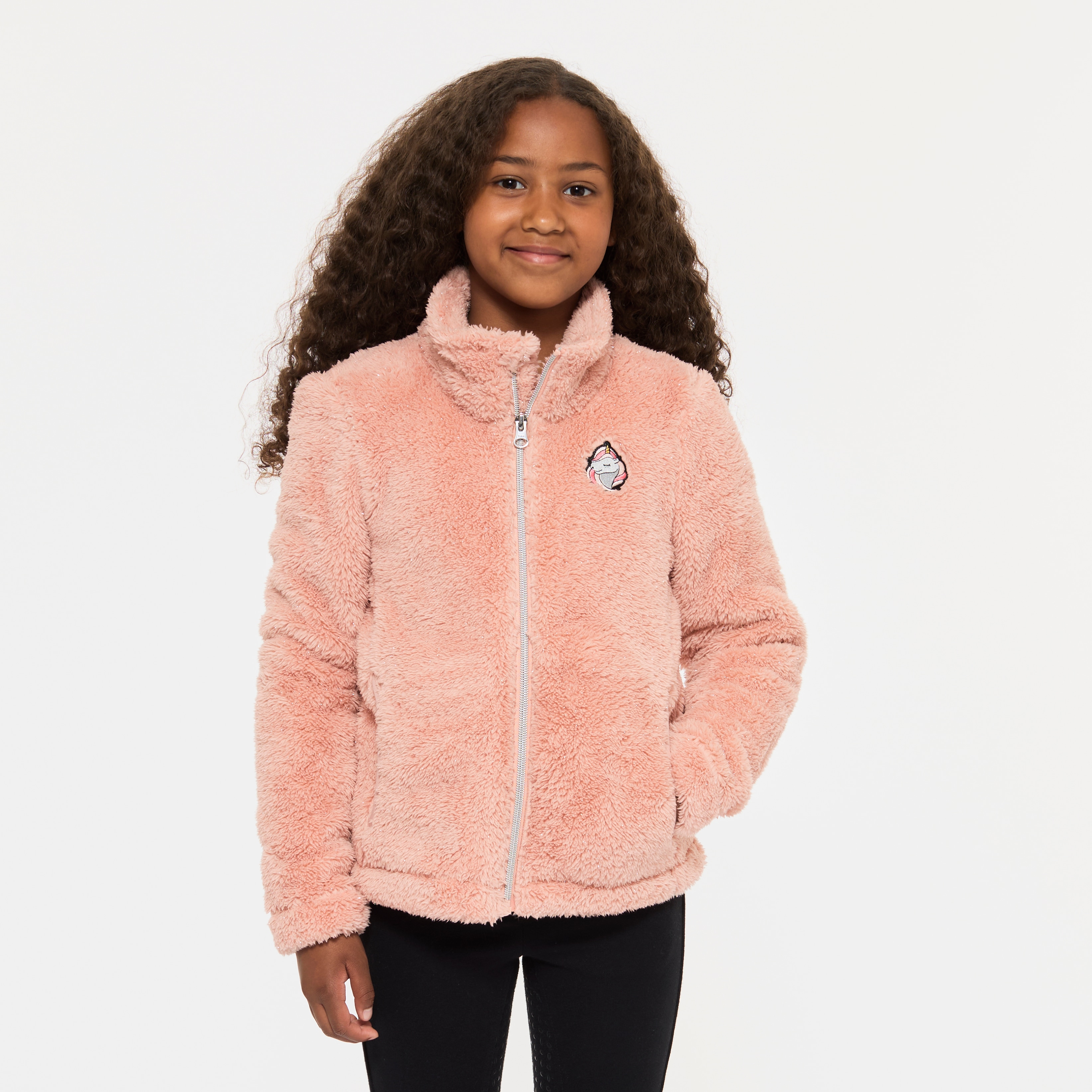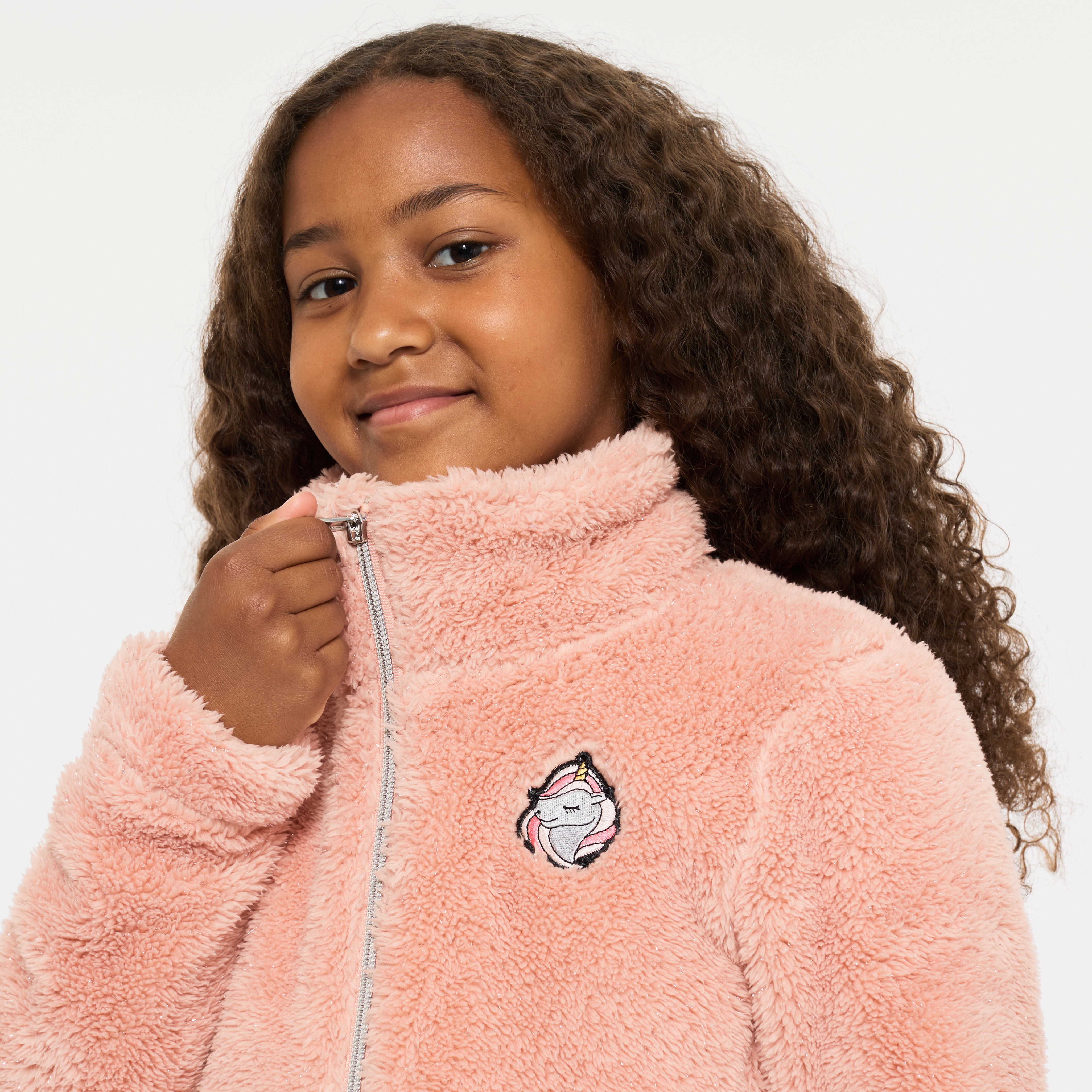 Sweater i blød fleece med høj krave, lynlås foran og to åbne lommer. Hagebeskytter, som sikrer, at trøjen sidder behageligt og ikke gnaver. Sweateren har glittertråde og en broderet enhjørning foran.