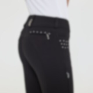 Vævede ridebukser med sadelsnit i strækbart funktionsmateriale. Formfast kvalitet, der er slidstærk, smudsafvisende og meget behagelig at have på. Knæbeskyttere med grip, hvor grebet også fortsætter på indersiden af lårene og giver optimalt fæste og støtte i sadlen, uden at bukserne er fuldt forstærkede. Elastik ved anklerne. Normal taljehøjde med dobbelt lukning for at holde ridebukserne sikkert på plads og give øget komfort. To forlommer og to lynlåslommer bagpå. Diskret mobillomme med lynlås på ydersiden af låret. Stilfuld detalje med rhinsten ved lommerne giver et elegant look. Lidt lille i pasformen. Vi anbefaler derfor, at du går en størrelse op.