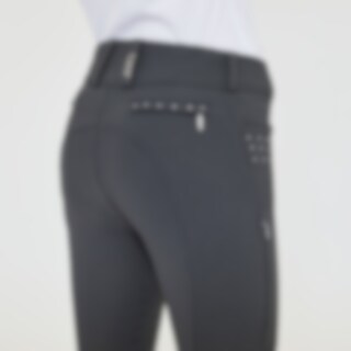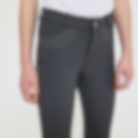 Vævede ridebukser med sadelsnit i strækbart funktionsmateriale. Formfast kvalitet, der er slidstærk, smudsafvisende og meget behagelig at have på. Knæbeskyttere med grip, hvor grebet også fortsætter på indersiden af lårene og giver optimalt fæste og støtte i sadlen, uden at bukserne er fuldt forstærkede. Elastik ved anklerne. Normal taljehøjde med dobbelt lukning for at holde ridebukserne sikkert på plads og give øget komfort. To forlommer og to lynlåslommer bagpå. Diskret mobillomme med lynlås på ydersiden af låret. Stilfuld detalje med rhinsten ved lommerne giver et elegant look. Lidt lille i pasformen. Vi anbefaler derfor, at du går en størrelse op.