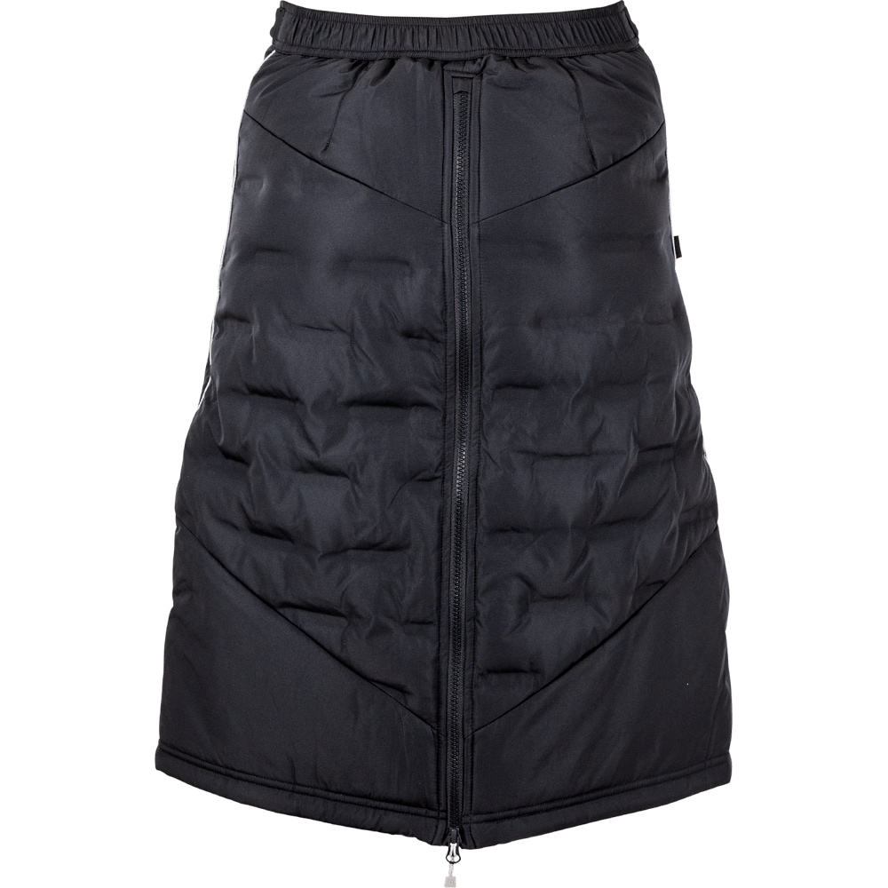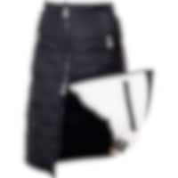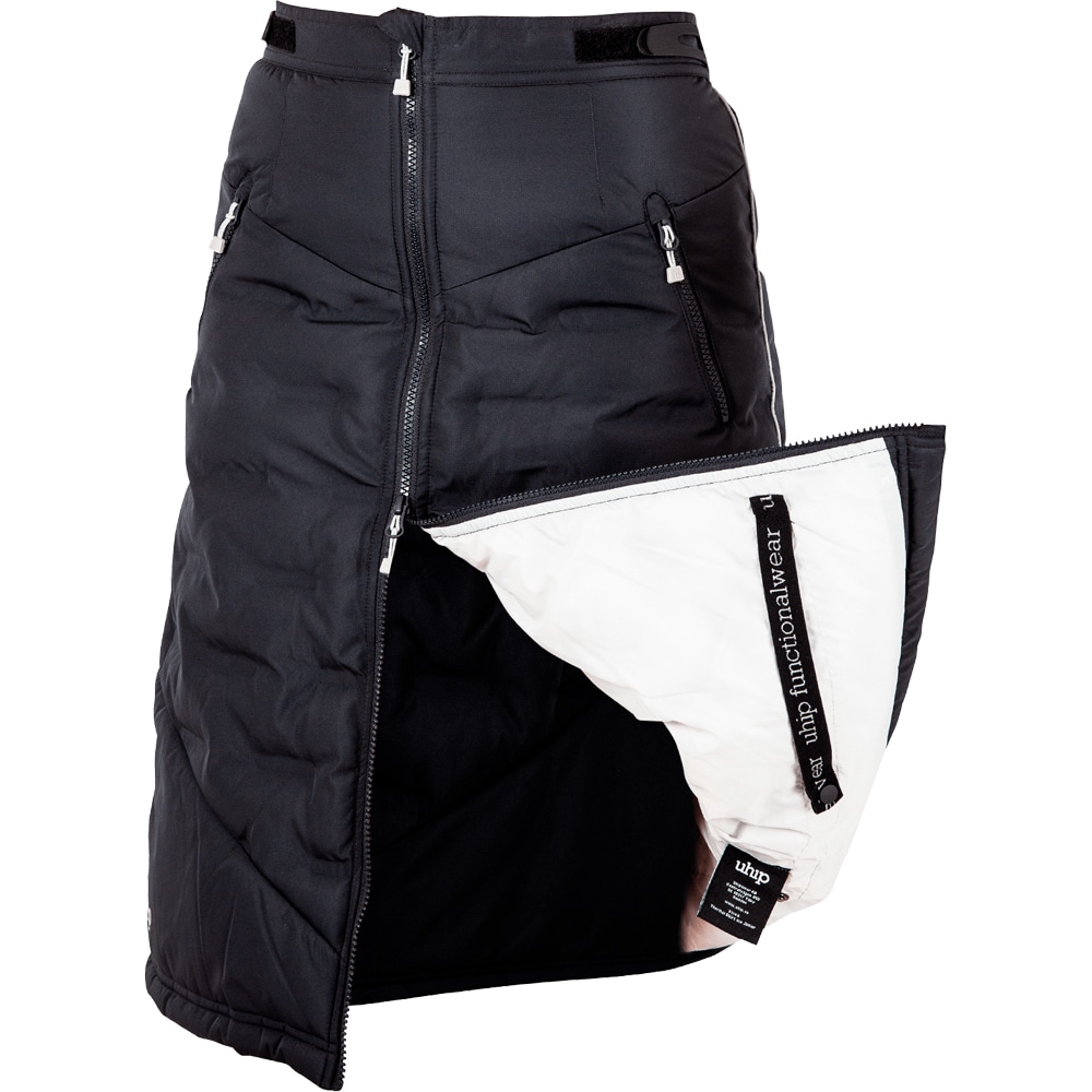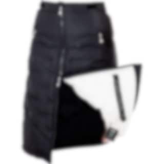 En varm og vejrbestandig overtræksnederdel med to-vejslynlås foran og slids med lynlås bagpå. Elastiske stropper på indersiden, som man sætter fast omkring lårene for at holde nederdelen på plads. Elastisk talje bagpå for perfekt pasform og taljejustering