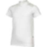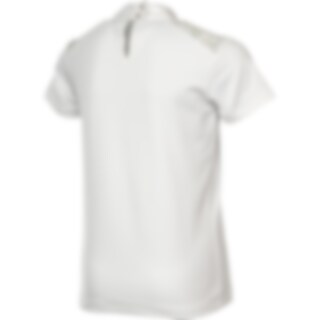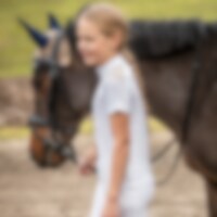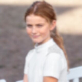 Kortærmet stævnetop i funktionsstof. Blondedetalje på skuldrene. Flot udsmykket med pailletter og perler på kraven. Åbning bagpå med elegante trykknapper.