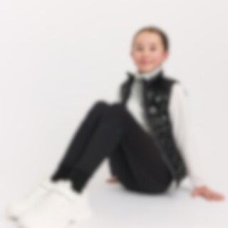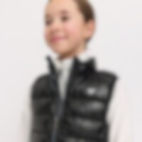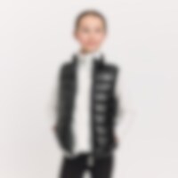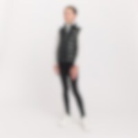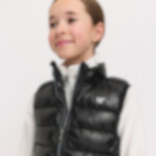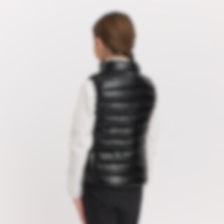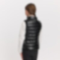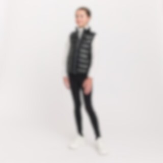 Sporty dynevest med skinnende effekt i stoffet. Polstret med polyesterfor, der efterligner og giver følelsen af dun. Elastisk kant i bunden og ærmegab. Lukkes nemt med lynlås. Vesten er udstyret med to praktiske forlommer.