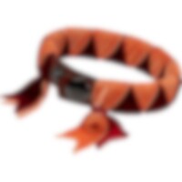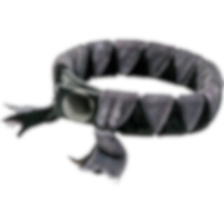 Armbånd i læder dekoreret med flettede velourbånd. To trykknapper til at justere størrelse med. Mål: Knap 1 18,5 cm. Knap 2: 20 cm.