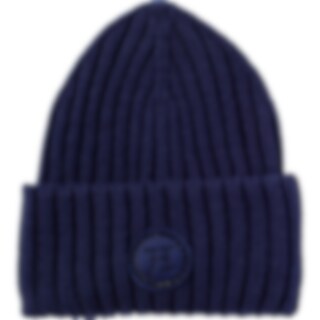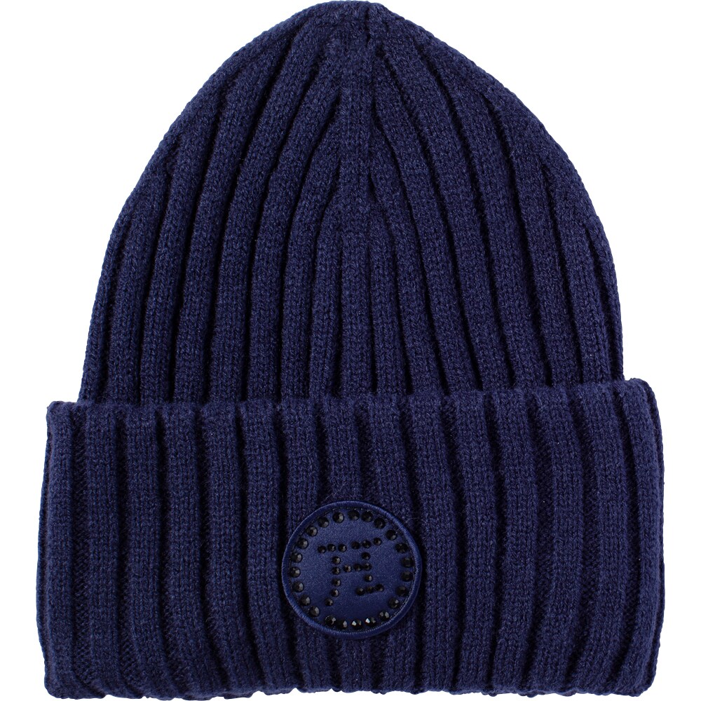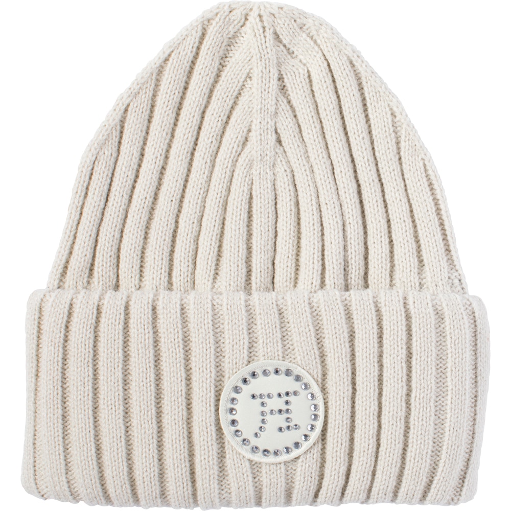Ribstrikket hue med varmende fleece på indersiden. Bred opfoldet kant fint dekoreret med logo med rhinsten.