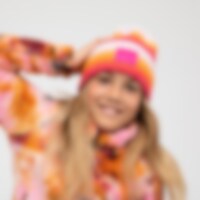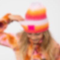 Ribbet hue i blødt, melangefarvet garn, der giver flotte farveskift. Bred opfoldet kant med vævet logoetiket.