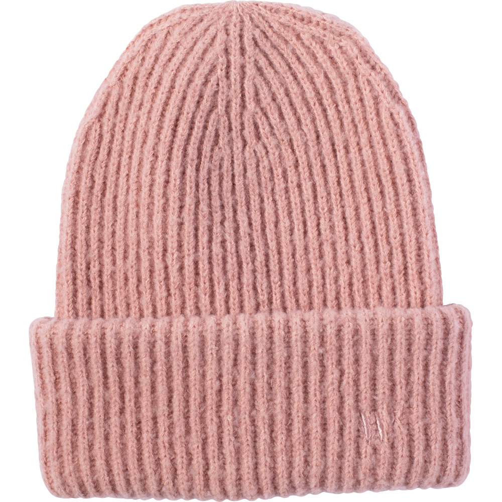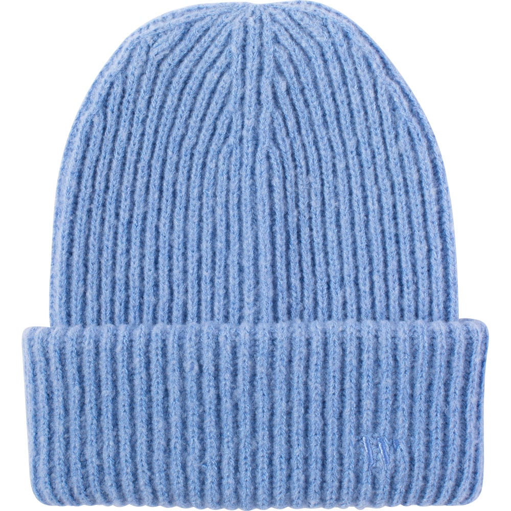Blød og varm ribstrikket hue. Bred opfoldet kant med broderi med logo.