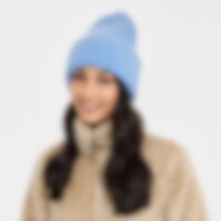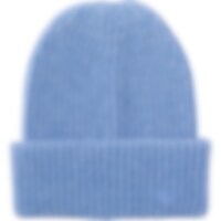 Blød og varm ribstrikket hue. Bred opfoldet kant med broderi med logo.