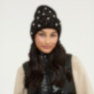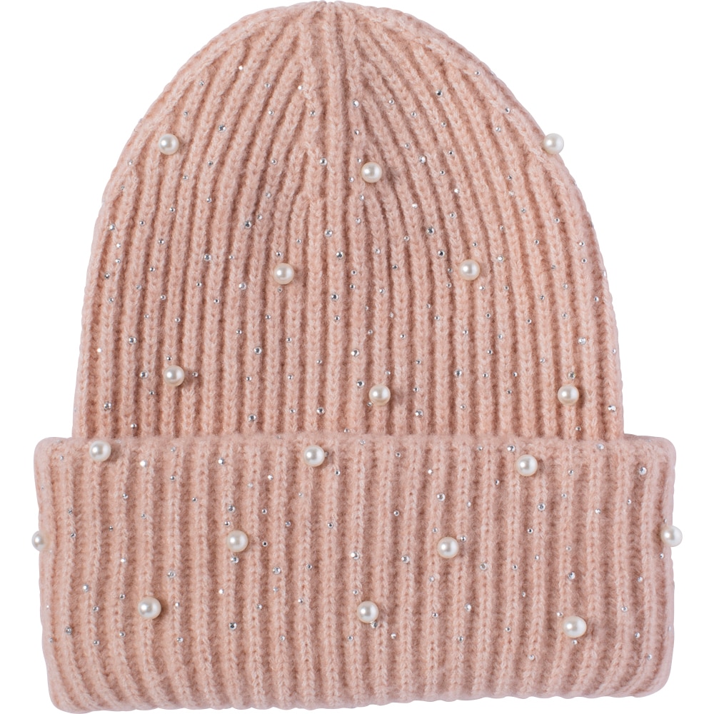 Ribstrikket hue fra Fairfield. Dekoreret med rhinsten og perler, som giver et nydeligt og moderne look. One size-størrelse.