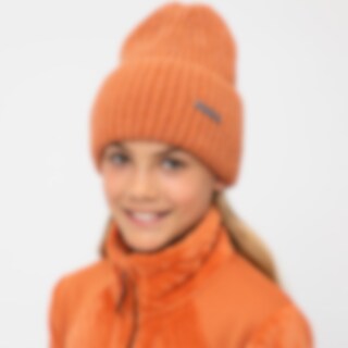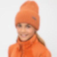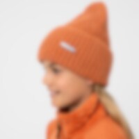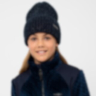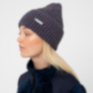 Ribstrikket hue med sølvfarvede lurextråde i garnet. Bred opfoldet kant med fine detaljer og logo.