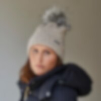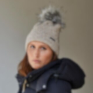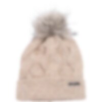Varmende hue med dekorativ kabelstrik og pompon i imiteret pels.
